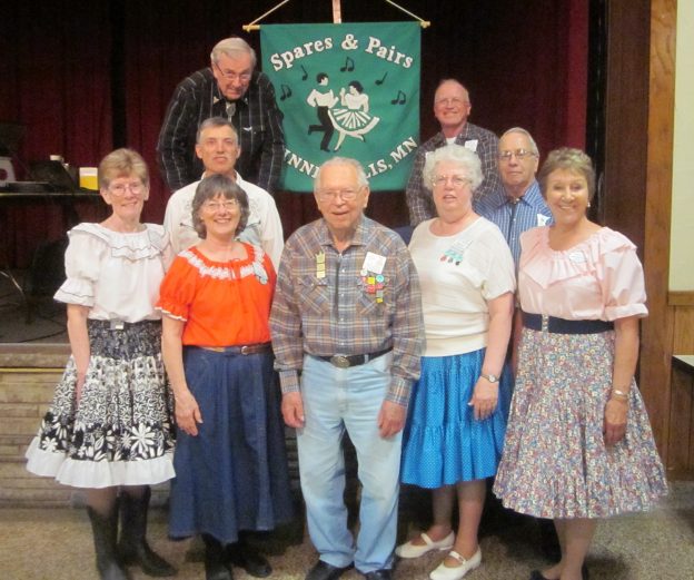 May 31, 2017 – Spares & Pairs Square Dance, Bloomington, Caller Dick Rueter, Cuer Ray Belanger, Guest Caller and Cuer Larry Fruetel. Eight squares from 10 organizations were present. Also present were Ar-Dale Dancers Queen Marlene and King Roger, Dakota Grand Squares Queen Eileen and King Darwin, Single Circles King Mel, Spares & Pairs Queen Cathy and King Fred, CSD Secretary Ken Scott, SDM Chair LeRoy Elfmann, SDM Treasurer Deb Hollimon, SDM Historian Al Martin, and SDM Marketing Director Dee Scott. County Line Squares with Caller Dick Rueter are pictured above.
