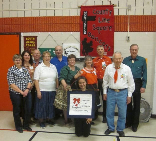 December 1, 2017 – County Line Squares “Ice Cream Social and Gary’s 75th Birthday Celebration” Square Dance, Monticello, Caller Abe Maier, Guest Caller Tom Allen, Cuer Ken LaBau. Fifteen squares with dancers from Beaux & Belles, County Line Squares, Dakota Grand Squares, Dan’se P.A.C., Hot Foot Stompers, Koronis Nite Owls, Single Circles, South Metro Stars, Spares & Pairs, Square & Twirl, and Westonka Whirlers were present. Also present were 12 non-dancing guests who had an opportunity to try square dancing. Dakota Grand Squares Queen Eileen and King Darwin, Square & Twirl Queen Patti and King Jerry, Spares & Pairs Queen Cathy and King Brad, Westonka Whirlers Queen Kathy and King Mark, Single Circles King Mel, County Line Squares Queen Susie and King Jim, CSD Chair Vince Dahlheimer, CSD Secretary Ken Scott, Federation At-Large Patti and Jerry Ellingson, SDM Chair LeRoy Elfmann, SDM Secretary Gael Zachman, SDM Treasurer Deb Hollimon, SDM Education Director Barry Downs, SDM Historian Al Martin, SDM Marketing Director Dee Scott, and SDM Membership Director Mary Kay Amberg were also present. Beaux & Belles (see photo above) and Spares & Pairs retrieved their banners and Hot Foot Stompers claimed a County Line Squares banner.