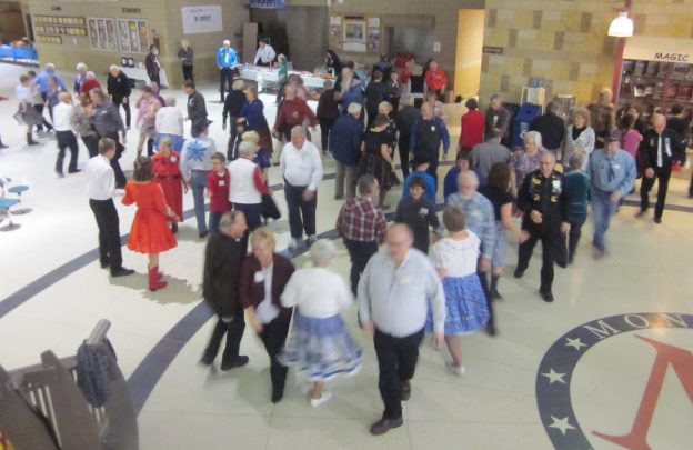 December 31, 2017 – County Line Squares “New Year’s Eve – Dancing Under the Stars” Square Dance, Monticello, Caller Abe Maier, Guest Caller Tom Allen, Cuer Jane Simpson. Ten squares with dancers (see photo above) from Beaux & Belles, Cambridge Corners, County Line Squares, Hot Foot Stompers, Koronis Nite Owls, Single Circles, Spares & Pairs, and Westonka Whirlers. Also present were Spares & Pairs Queen Kathy and King Brad, County Line Squares Queen Susie and King Jim, SDM Chair LeRoy Elfmann, SDM Secretary Gael Zachman, SDM Education Director Barry Downs, and SDM Historian Al Martin.