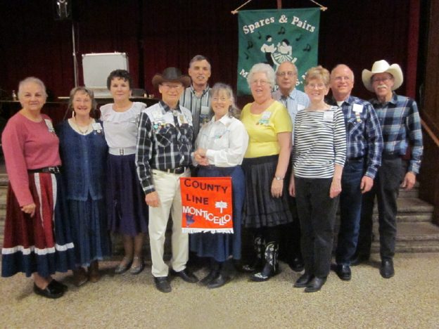 January 10, 2018 – Spares & Pairs “RoundUp Subscription” Square Dance, Bloomington, Caller Larry Fruetel, Cuer Ray Belanger. Five squares with dancers from Westonka Whirlers, Sunday Squares, Spares & Pairs, Dakota Grand Squares, County Line Squares, and Ar-Dale Dancers were present. Also present were Ar-Dale Dancers Queen Marlene and King Roger, County Line Squares Queen Susie, Dakota Grand Squares Queen Eileen and King Darwin, Federation Vice President Brian Freed, SDM Chair LeRoy Elfmann, SDM Secretary Gael Zachman, SDM Treasurer Deb Hollimon, SDM Education Director Barry Downs, SDM Historian Al Martin, and SDM Marketing Director Dee Scott. County Line Squares retrieved their banner (see photo above).