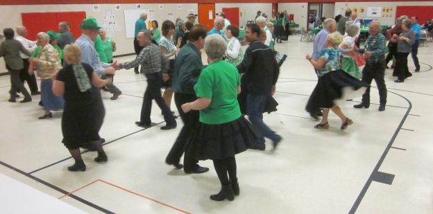 March 9, 2018 – County Line Squares “Shamrock Shuffle” Square Dance, Monticello, Caller Abe Maier, Cuer Sarah Klaphake. Ten squares with dancers from ten organizations (Ar-Dale Dancers, Beaux & Belles, Cambridge Corners, County Line Squares, Hot Foot Stompers, Koronis Nite Owls, Rockin’ Country Dancers, Single Circles, Spares & Pairs, and Westonka Whirlers) were present. Also present were Hot Foot Stompers Queen Rose, County Line Squares Queen Susie, Federation President Michelle Jensen, the RoundUp Advertising Manager Connie Walker-Pearson, the RoundUp Subscription Manager and Enhancin’ Dancin’ Editor Paul Pearson, SDM Chair LeRoy Elfmann, SDM Secretary Gael Zachman, SDM Historian Al Martin, and SDM Marketing Director Dee Scott.