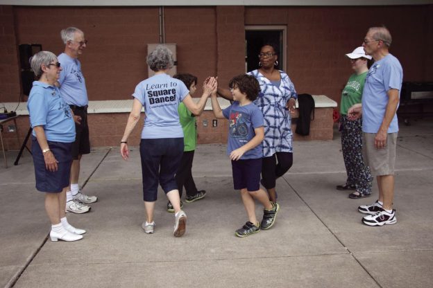 August 11, 2018 – Lions Corn Feed and Hot Rod Show Square Dance Demo, Crystal, Caller Dick Rueter. Come Square Dance and Single Circles sponsored. Crystal Sun Post Staff Photo by Laura Kay Prosser features in no particular order – Angela Melgat, Greg Melgat, Josephene Ostenberg, William Nichols, Charles Nichols, Carla White, Mary Kay Amberg, and Vince Dahlheimer square dancing on the stage in Becker Park.