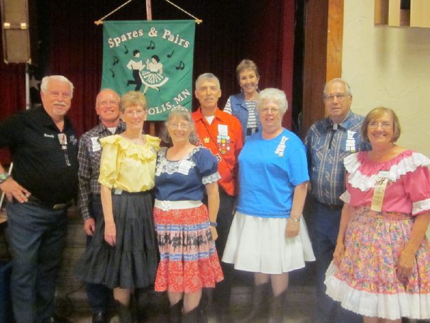 September 12, 2018 – Spares & Pairs Square Dance, Bloomington, Caller Randy Dougherty, Cuer Robin Fryman. Dancers present were from County Line Squares, Dakota Grand Squares, Hot Foot Stompers, South Metro Stars, Spares & Pairs, Square & Twirl, and Triple T. Also present were County Line Squares Queen Gael and King Doug, Spares & Pairs Queen Jennifer and King Barry, SDM Vice Chair Barry Downs, SDM Treasurer Gael Zachman, SDM Executive Director LeRoy Elfmann, SDM Historian Al Martin, and SDM Membership Director Mary Kay Amberg. County Line Squares claimed a Spares & Pairs banner (see photo above).