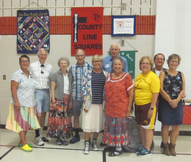 September 14, 2018 – County Line Squares “Mismatch” Square Dance, Monticello, Caller Abe Maier, Cuer Jane Simpson. Organization members present were from Ar-Dale Dancers, County Line Squares, Dakota Grand Squares, Hot Foot Stompers, Koronis Nite Owls, Single Circles, South Metro Stars, Spares & Pairs, Triple T, Westonka Whirlers, and Wildcatter Squares (Humble, TX). Also present were Westonka Whirlers Queen Anita and King Bill, Spares & Pairs Queen Jennifer and King Barry, County Line Squares Queen Gael and King Doug, Come Square Dance Chair Vince Dahlheimer, RoundUp Editors Jeannine and Bob Maiden, SDM Vice Chair Barry Downs, SDM Secretary Gael Zachman, SDM Executive Director LeRoy Elfmann, SDM Historian Al Martin, and SDM Membership Director Mary Kay Amberg. Single Circles claimed a County Line Squares banner (see photo above). Koronis Nite Owls and Spares & Pairs retrieved their banners (see photos below).