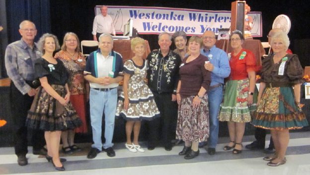 September 15, 2018 – Westonka Whirlers “Welcome to Fall” Square Dance, Mound, Caller Dick Rueter, Cuer Ken LaBau. Dancers from County Line Squares, Crystal Cross Trailers, Dakota Grand Squares, Single Circles, South Metro Stars, Spares & Pairs, and Westonka Whirlers were present. Also present were County Line Squares Queen Gael and King Doug, Spares & Pairs Queen Jennifer and King Barry, Westonka Whirlers Queen Anita and King Bill, SDM Vice Chair Barry Downs, SDM Treasurer Gael Zachman, SDM Executive Director LeRoy Elfmann, SDM Historian Al Martin, SDM Marketing Director Dee Scott, and SDM Membership Director Mary Kay Amberg. Spares & Pairs (see photo above) and County Line Squares claimed Westonka Whirlers banners (see photo below).