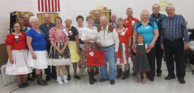 September 21, 2018 – Single Circles “Back to School” Square Dance, Maple Grove, Caller Dick Rueter, Cuer Jane Simpson. Dancers from Westonka Whirlers, Spares & Pairs, Single Circles, Hot Foot Stompers, First City Squares, Dakota Grand Squares, Crystal Cross Trailers, and County Line Squares were present. Also present were County Line Squares Queen Gael and King Doug, Hot Foot Stompers Queen Coni, SDM Treasurer Gael Zachman, SDM Executive Director LeRoy Elfmann, and SDM Historian Al Martin. County Line Squares retrieved their banner (see photo above) and Hot Foot Stompers claimed a Single Circles banner (see photo below).