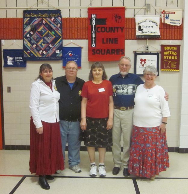 December 14, 2018 – County Line Squares “Winter Wonderland” Square Dance, Monticello, Caller Abe Maier, Cuer Jane Simpson. Dancers from Westonka Whirlers, Wadena Whirlaways, Triple T, Single Circles, Koronis Nite Owls, Jolly Promenaders, Hot Foot Stompers, and Cambridge Corners joined the County Line Squares dancers. County Line Squares Queen Gael and King Doug, SDM Treasurer Gael Zachman, SDM Executive Director LeRoy Elfmann, and SDM Marketing Director Dee Scott were present. Koronis Nite Owls claimed a County Line Squares banner (see photo above).