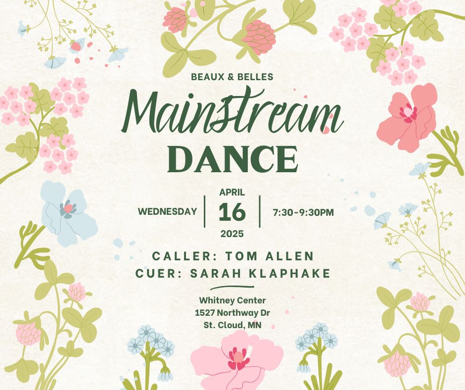 Square Dance (Caller Tom Allen – “Mainstream” 7:30-9:30 pm, “Plus” 9:30-10:00 pm; Cuer Sarah Klaphake – “Rounds” between tips), Potluck will be served during the dance. Beaux & Belles Flyer