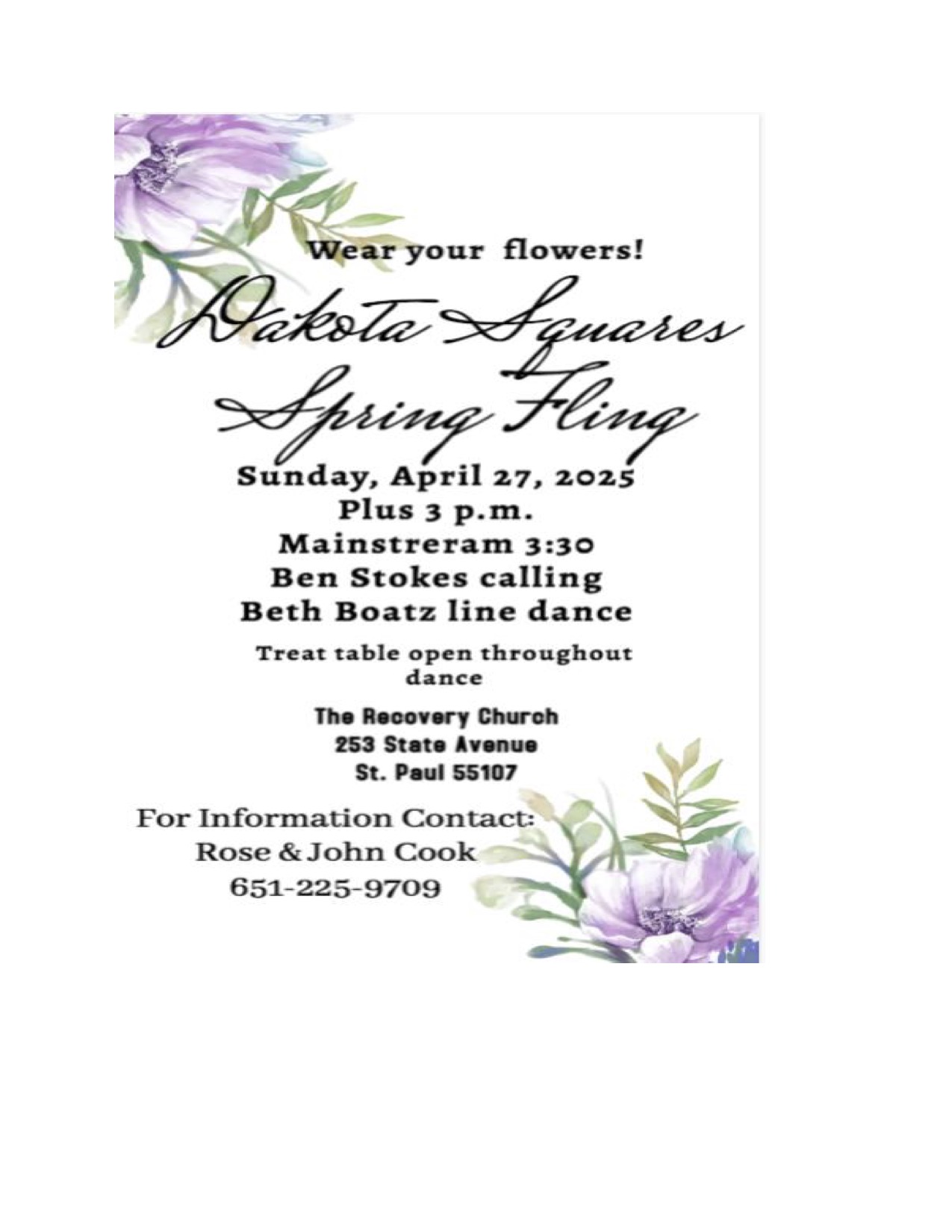“Spring Fling” Square Dance (Caller Ben Stokes – “Plus” 3:00-3:30 pm, “Mainstream” 3:30-5:30 pm; Cuer Beth Boatz “Line dancing” between tips.) Bring a dish to share. Potluck treat table all afternoon. Dakota Squares Flyer