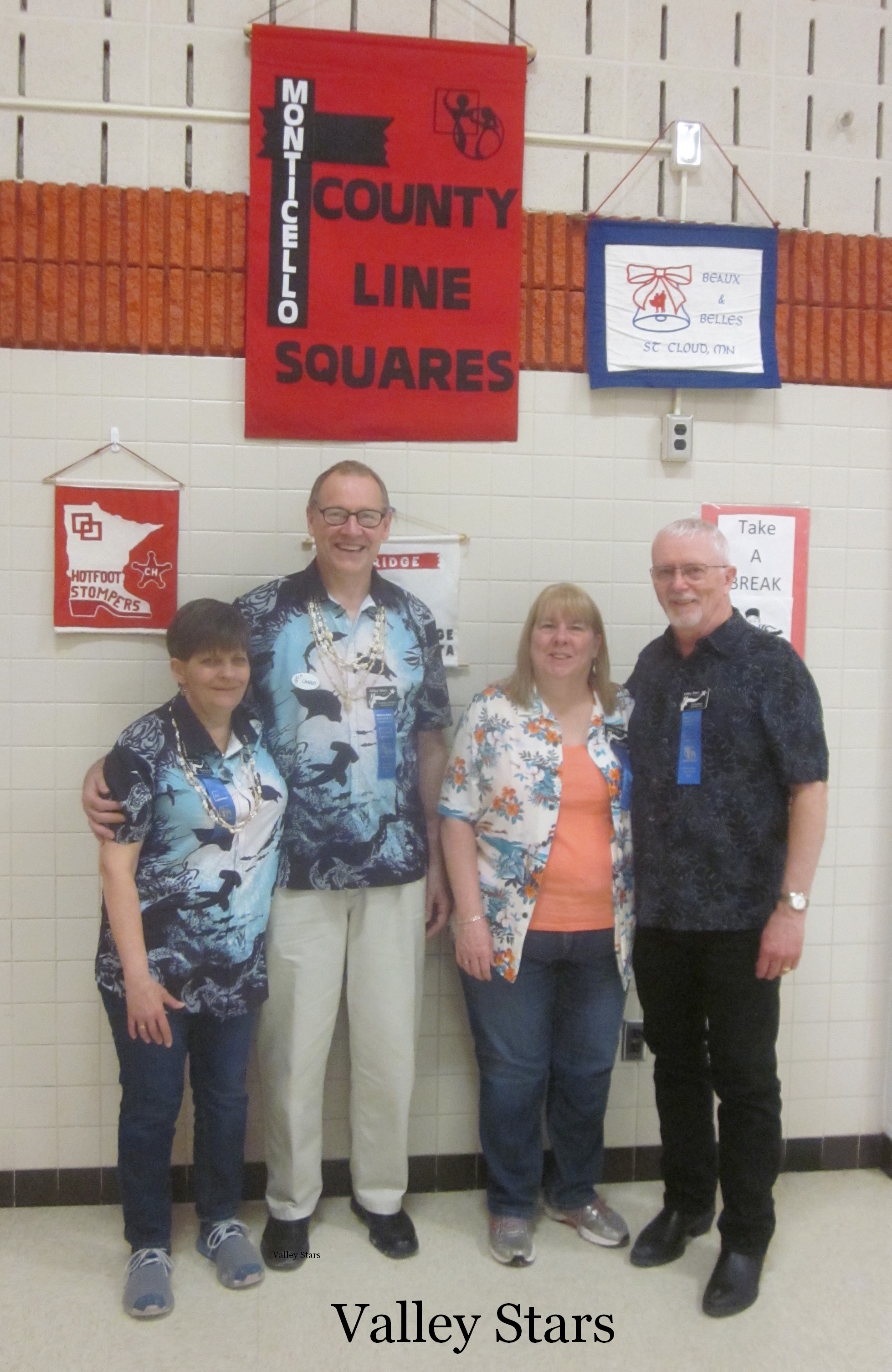 April 8, 2022 – County Line Squares “Beach Party” Square Dance, Monticello, Caller Charley Huhtala, Cuer Ken LaBau. Afternoon Squares, Ar-Dale Dancers, Beaux & Belles, Hotfoot Stompers, Koronis Nite Owls, Valley Stars (see photo above), Westonka Whirlers danced with County Line Squares. County Line Squares Queen Char and King Bill, Hotfoot Stompers Queen Sharon, SDM Chair LeRoy Elfmann, SDM Treasurer Gael Zachman, SDM Historian Al Martin, SDM Marketing Director Dee Scott, and SDM Membership Director Mary Kay Amberg were present. Westonka Whirlers retrieved their banner and Koronis Nite Owls claimed a County Line Squares banner (see photos below).