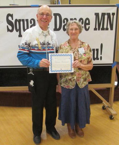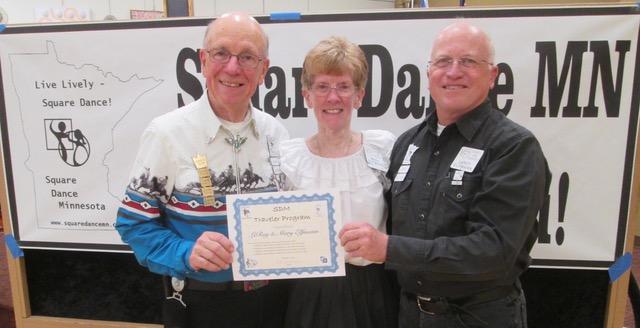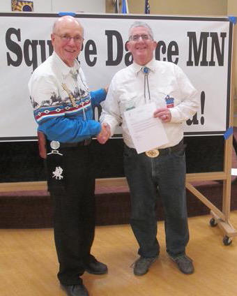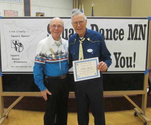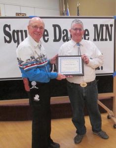 November 2, 2019 – Square Dance Minnesota Fall Festival, St Cloud, Callers Tom Allen, John Bittner, Vic Diller, Andy Flint, Monte Guenzler, Charley Huhtala, Larry Johansen, Rick Larson, Abe Maier, Roger McNeil, Dick Severson, and John Weldon, Cuers Sarah Klaphake, Ken LaBau, Bernadette McNeil, and Jane Simpson. Dancers from Ar-Dale Dancers, Beaux & Belles, Cambridge Corners, Country Twirlers, County Line Squares, Dakota Squares, ETTA Square & Rounds, Hot Foot Stompers, Jolly Twirlers, Kaleidoscope Squares, Koronis Nite Owls, L & M Squares, North Country Plus, Rays Promenaders, Rockin’ Country Dancers, Saturday Fun Nite, Single Circles, South Metro Stars, Spares & Pairs, Wadena Whirlaways, and Westonka Whirlers were present. Twelve callers and four cuers kept the dance lively (see photo above). Awards were presented (see below) by SDM Chair Barry Downs.