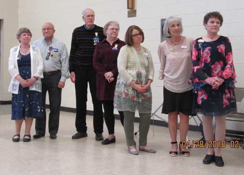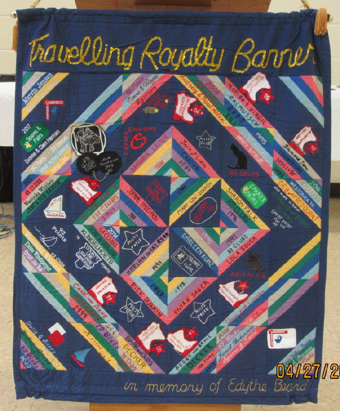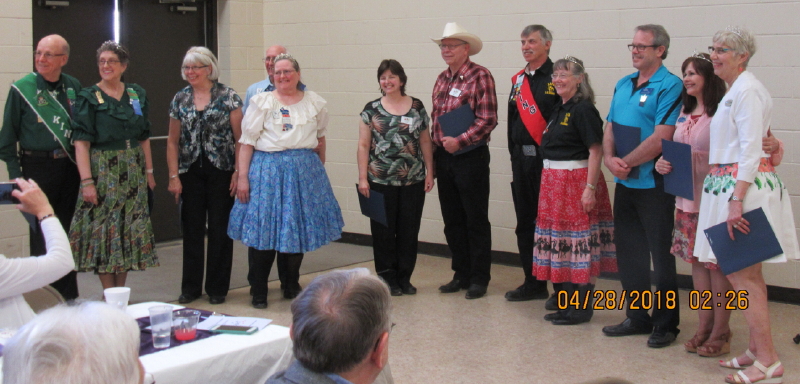April 28, 2018 – 37th Annual Royalty Luncheon hosted by Dakota Grand Squares, Inver Grove Heights. Royalty from the Minnesota square dance organizations that participate held a luncheon where the Edythe Beard Travelling Royalty Banner (see photo above) was presented to the past year royalty that earned the most points. This year’s recipient was County Line Squares Queen Susie Oachs (see photo above).