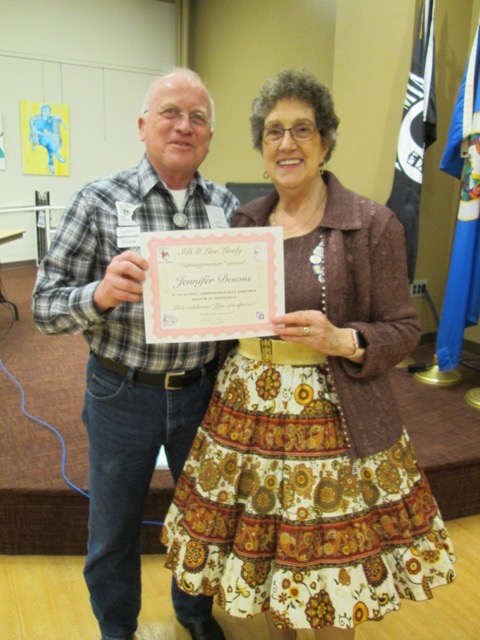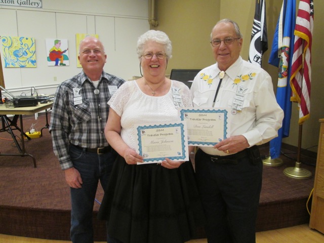 February 3, 2018 – SDM Winter Festival “Board Meeting, Dance, and Awards Presentation” Square Dance, St. Cloud, Callers Tom Allen, Andy Flint, Tom Jacobs, Roger McNeil, Cuers Sarah Klaphake, Ken LaBau, Bernadette McNeil. Forty-six dancers were present from Beaux & Belles, Cambridge Corners, County Line Squares, ETTA Square & Rounds, F-M Square Dancers Association, Jolly Twirlers, Koronis Nite Owls, L & M Squares, Rockin’ Country Dancers, Saturday Fun Nite, Single Circles, South Metro Stars, Spares & Pairs, Wadena Whirlaways, and Westonka Whirlers. Mavis Johnson received the Most-Active Dancer award (see photo above) having participated in 139 dance events during the period July 1 through December 31, 2017.