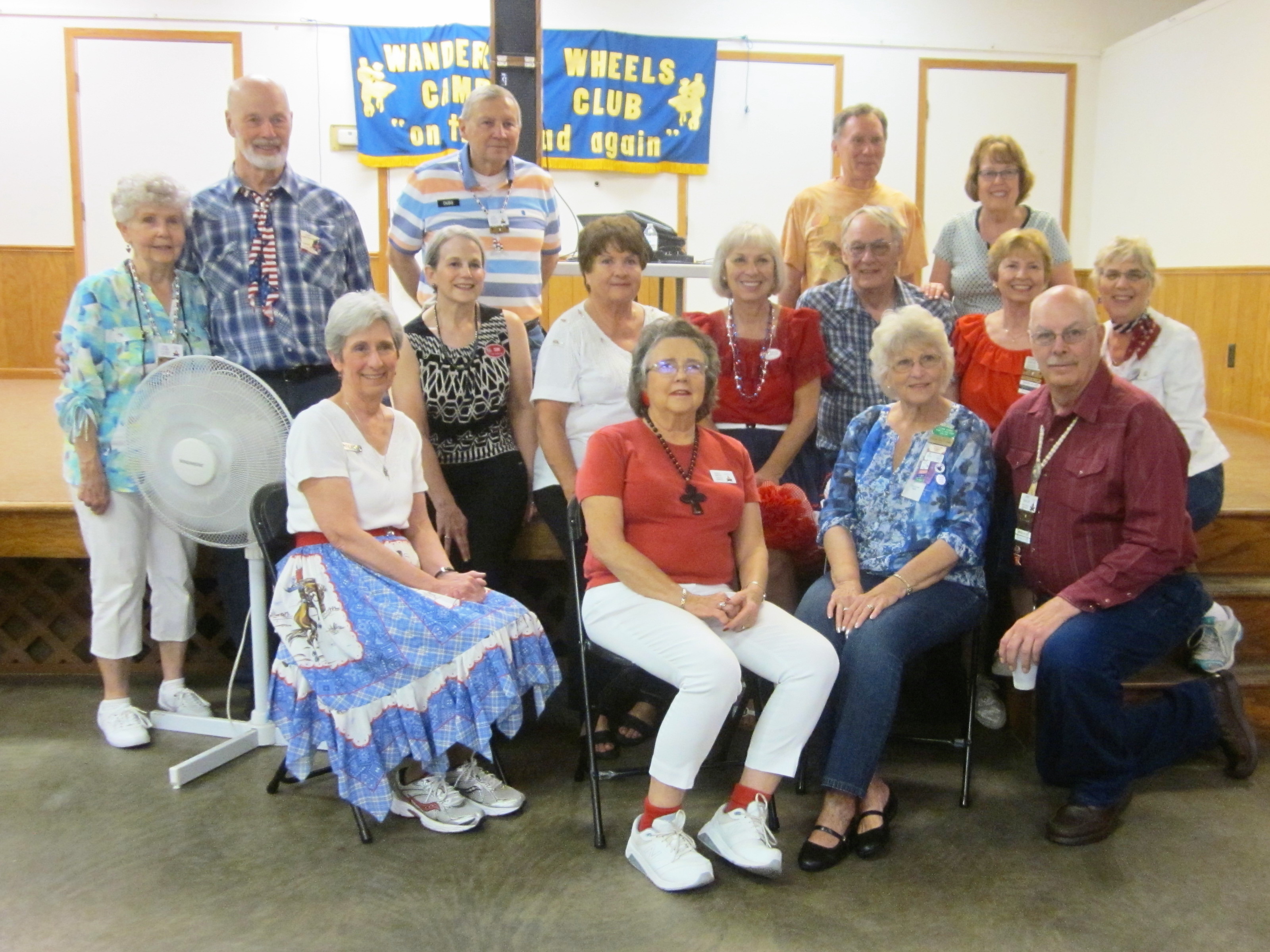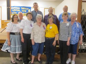 May 26, 2017 – Wandering Wheels “S-more Fun” Square Dance, Cambridge, Caller Tom Allen. Eleven squares from 11 organizations (including 50 guest dancers) were present. Also attending were Cambridge Corners Queen Kim, County Line Squares Queen Susie and King Jim, and Hot Foot Stompers Queen RoseMary. Pictured above is Beaux & Belles with Caller Tom Allen.