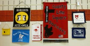 May 5, 2017 – County Line Squares “Country Roads” Square Dance, Monticello, Caller Abe Maier, Cuer Sarah Klaphake, Guest Caller Denise Heinz. Nine squares with dancers from Westonka Whirlers, Wadena Whirlaways, Single Circles, Jolly Twirlers, Hot Foot Stompers, Friendly Twirlers, and County Line Squares were present. Also present were Friendly Twirlers Queen Lisa, County Line Queen Susie and King Jim, CSD Chair Vince Dahlheimer, and SDM Chair LeRoy Elfmann. Friendly Twirlers retrieved their banner (see photo above).