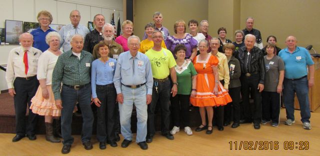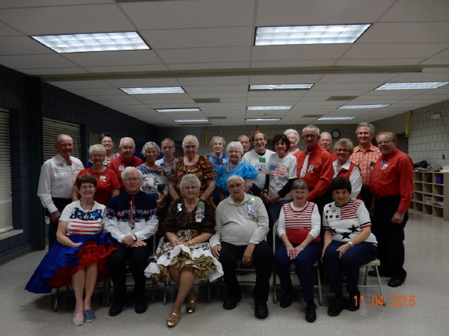 November 4, 2016 – County Line Squares “Salute to Veterans” Square Dance, Monticello, Caller Abe Maier, Cuer Jane Simpson. Seven squares with dancers from seven organizations (Spares & Pairs, Hot Foot Stompers, Westonka Whirlers, Dan’se P.A.C., Single Circles, Wadena Whirlaways, and County Line Squares) were present. Also present were County Line Squares Queen Helen and King Steve, SDM Chair LeRoy Elfmann, and SDM Treasurer Deb Hollimon.