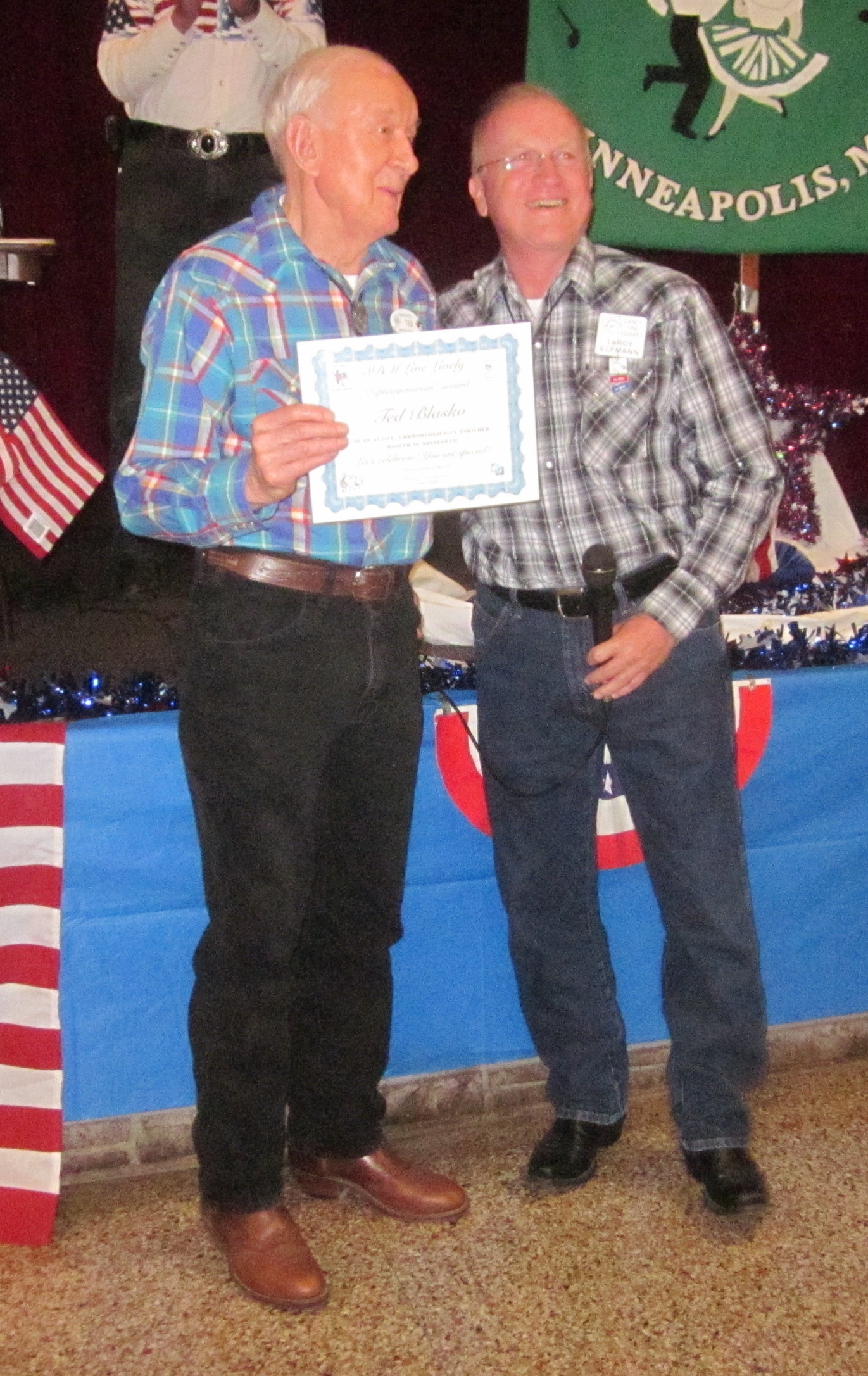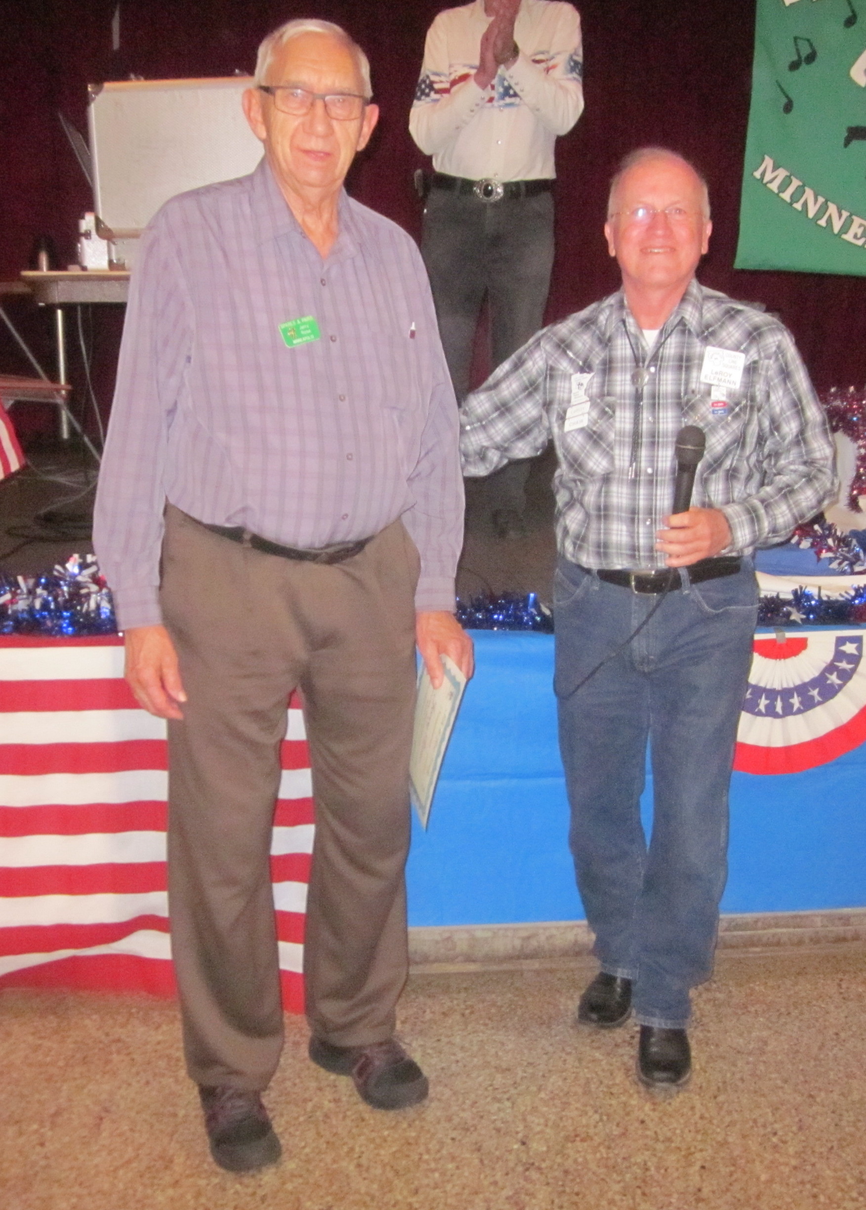 November 9, 2016 – Spares & Pairs “Honor Our Veterans” Square Dance, Bloomington, Caller Larry Fruetel, Caller Ray Belanger. Eight squares with dancers from Afternoon Squares, Ar-Dale Dancers, Bloomington Swirlers, County Line Squares, Dan’se P.A.C., Dakota Grand Squares, Hot Foot Stompers, Spares & Pairs, and Westonka Whirlers were present. Also present were Bloomington Swirlers Queen Su, County Line Squares Queen Helen and King Steve, Dakota Grand Squares Queen Becky, SDM Chair LeRoy Elfmann, SDM Treasurer Deb Hollimon, and SDM Historian Al Martin.