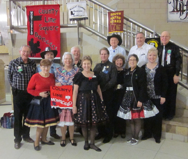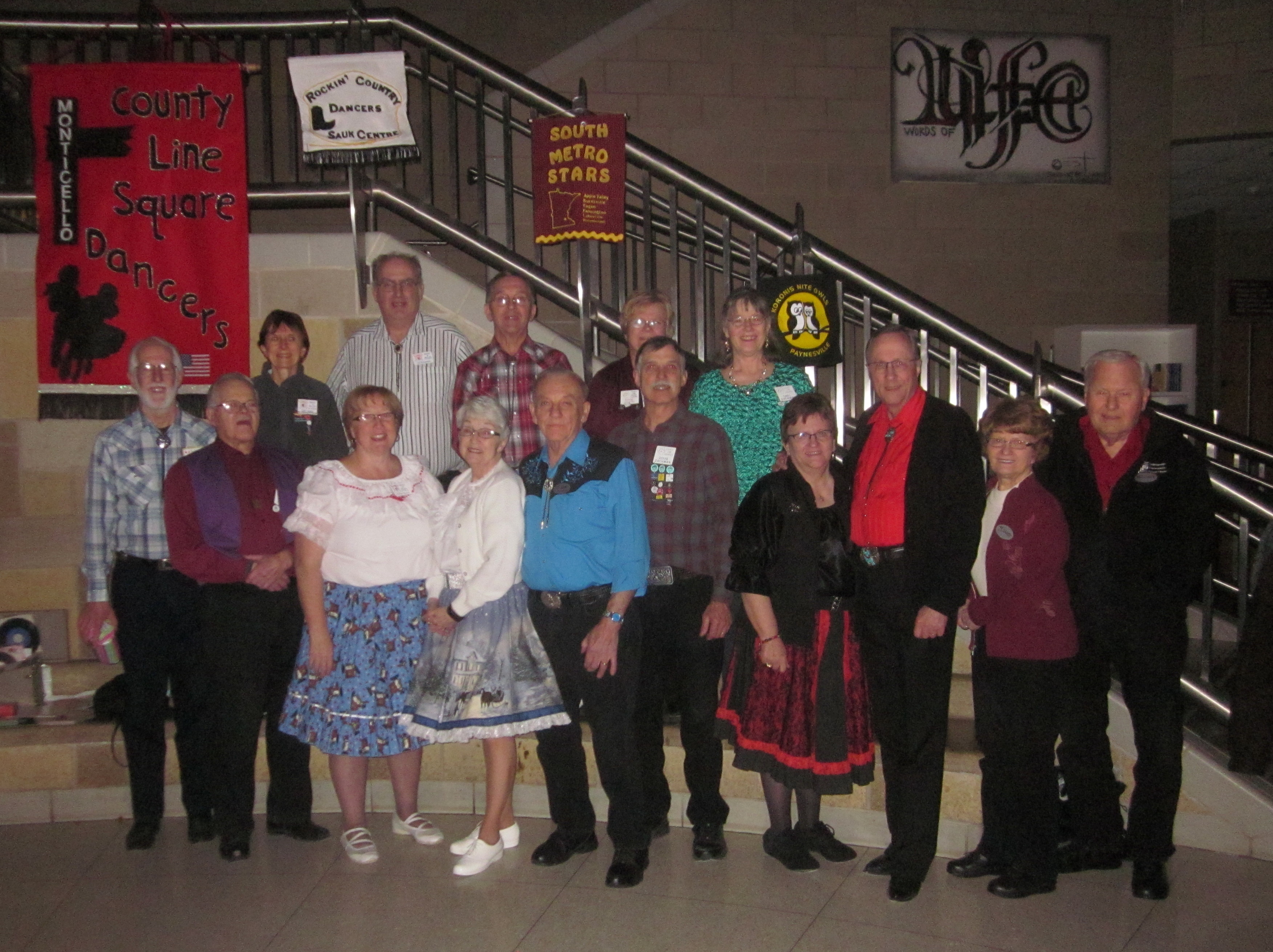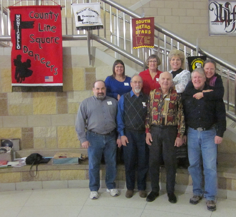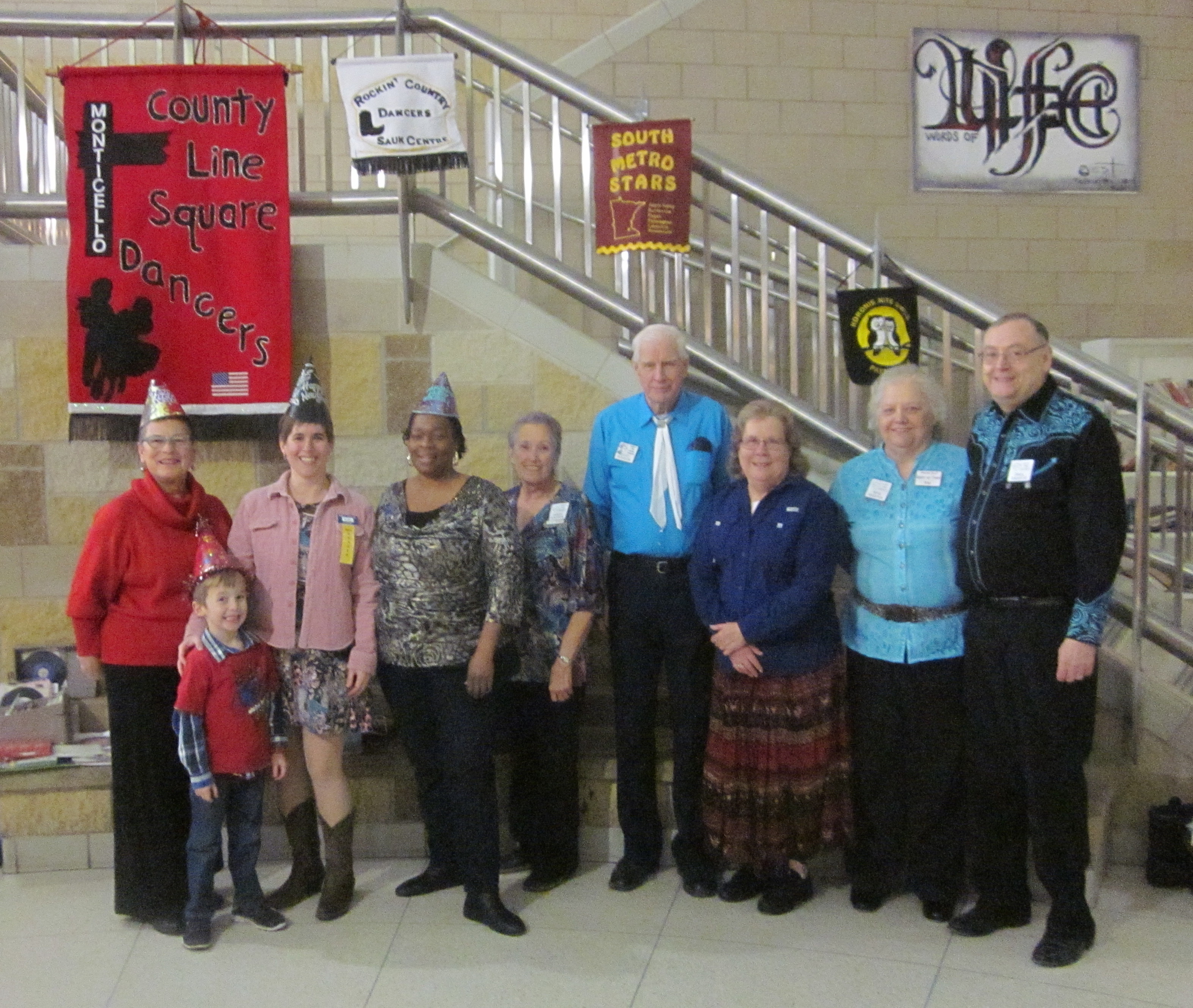 December 31, 2017 – County Line Squares “New Year’s Eve – Dancing Under the Stars” Square Dance, Monticello, Caller Abe Maier, Guest Caller Tom Allen, Cuer Jane Simpson. Ten squares with dancers (see photo above) from Beaux & Belles, Cambridge Corners, County Line Squares, Hot Foot Stompers, Koronis Nite Owls, Single Circles, Spares & Pairs, and Westonka Whirlers. Also present were Spares & Pairs Queen Kathy and King Brad, County Line Squares Queen Susie and King Jim, SDM Chair LeRoy Elfmann, SDM Secretary Gael Zachman, SDM Education Director Barry Downs, and SDM Historian Al Martin.
