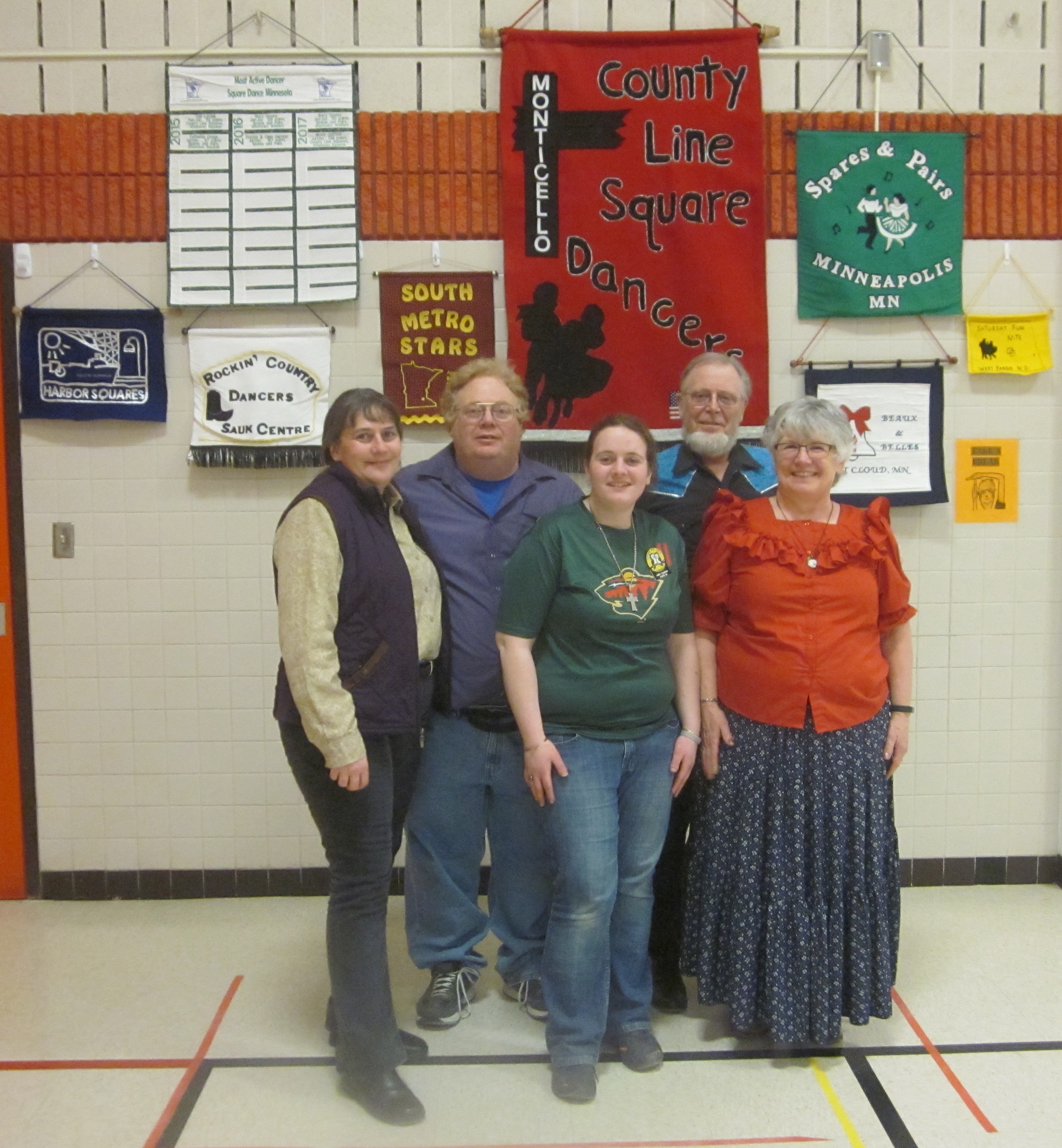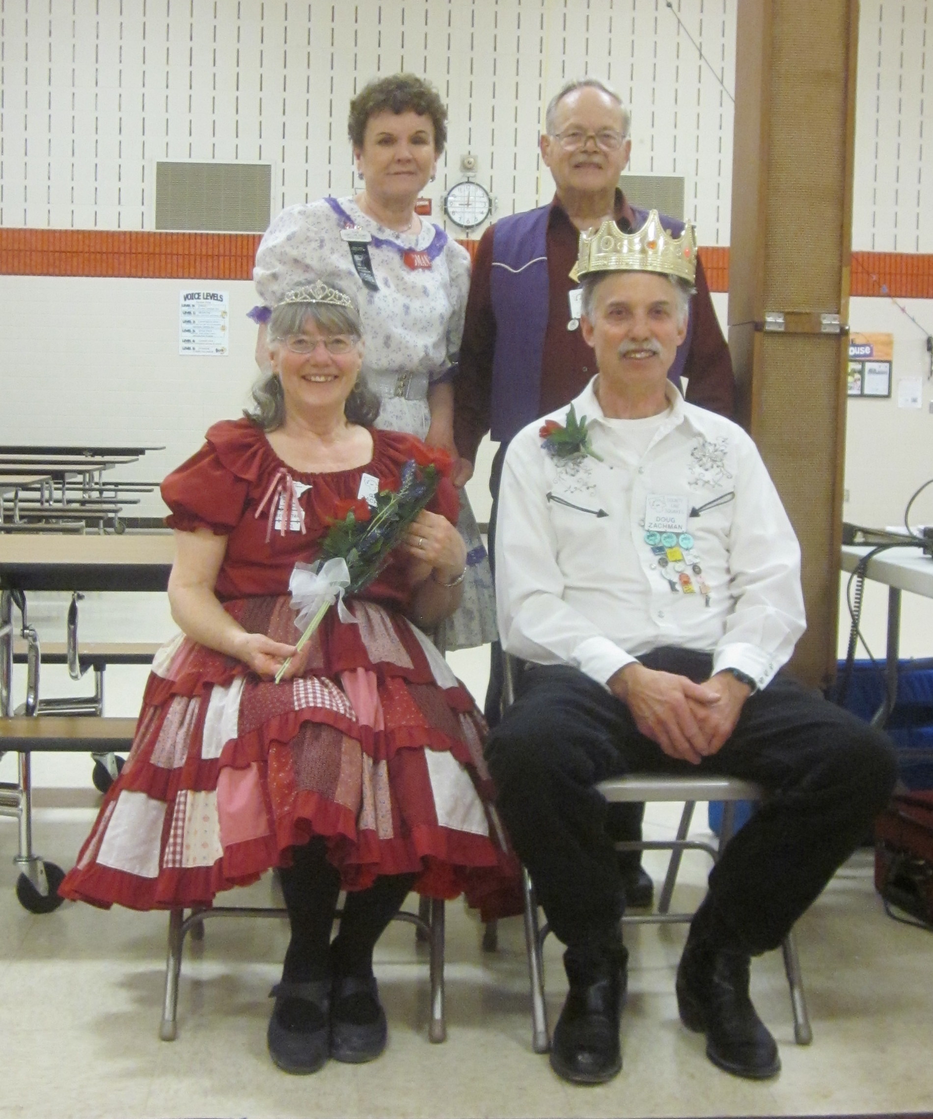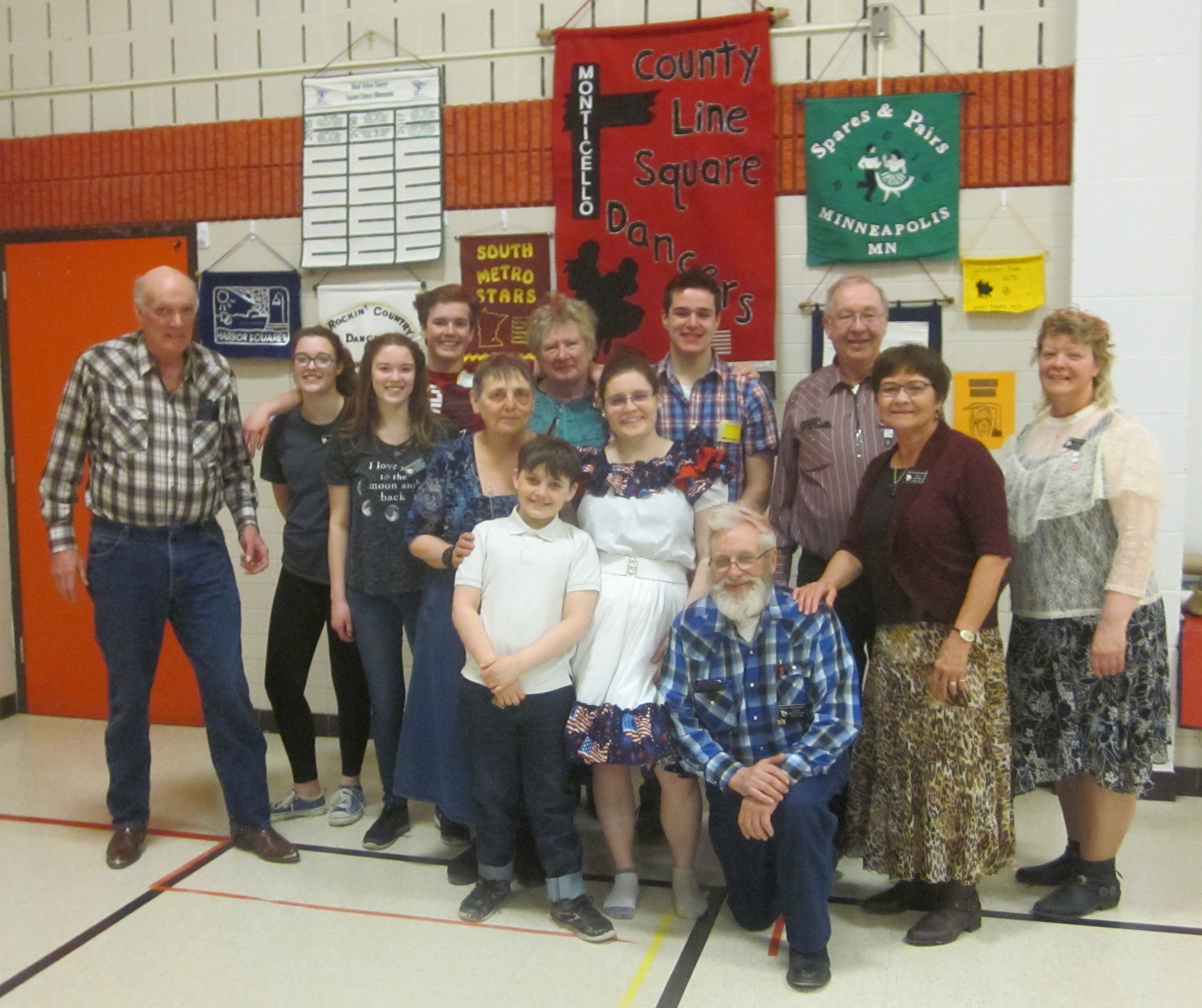 April 6, 2018 – County Line Squares “Bad Hair Night” Square Dance, Monticello, Caller Roger McNeil, Cuer Bernadette McNeil. Ten squares with dancers (see photo above) from Ar-Dale Dancers, Circle 8 Plus, County Line Squares, Dan’se P.A.C., Hot Foot Stompers, Koronis Nite Owls, Single Circles, South Metro Stars, Spares & Pairs, Wadena Whiralways, and Wandering Wheels were dancing. Present were Spares & Pairs Queen Jennifer and King Barry, County Line Squares Queen Susie and King Jim, newly crowed County Lein Squares Queen Gael and King Doug, Come Square Dance Chair Vince Dahlheimer, SDM Chair LeRoy Elfmann, SDM Vice Chair Linda Brotherton, SDM Secretary Gael Zachman, SDM Education Director Barry Downs, SDM Historian Al Martin, SDM Membership Director Mary Kay Amberg, Caller Andy Flint, Caller Mark Helfter, and Caller Abe Maier. Koronis Nite Owls and Wadena Whirlaways claimed County Line Squares banners.
