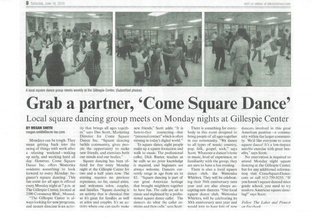 Laker Pioneer Article June 16, 2018 – The Laker Pioneer Newspaper ran a half-page story about square dancing at The Gillespie Center!
