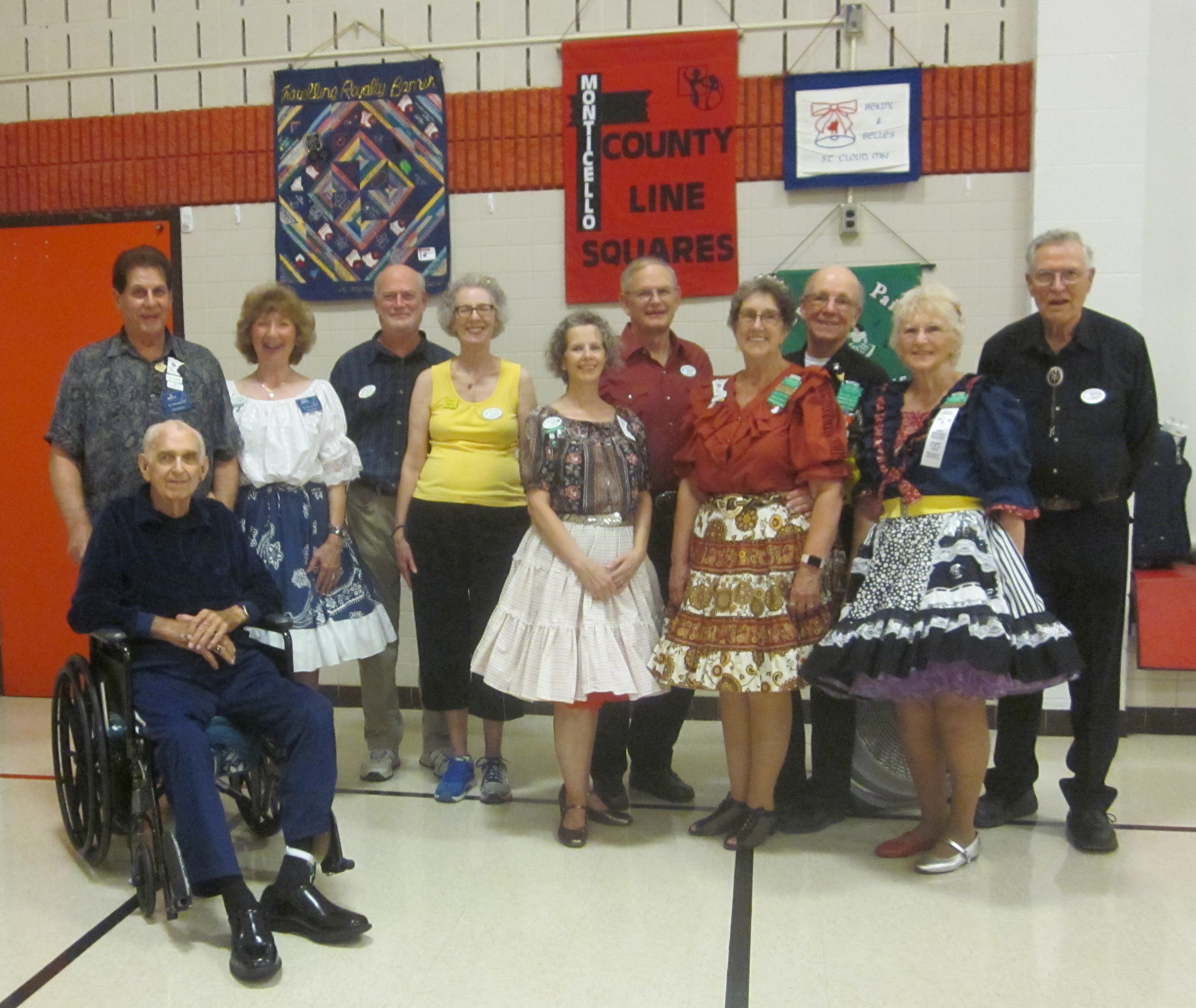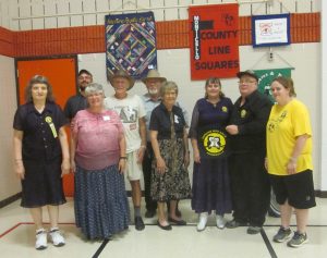 September 14, 2018 – County Line Squares “Mismatch” Square Dance, Monticello, Caller Abe Maier, Cuer Jane Simpson. Organization members present were from Ar-Dale Dancers, County Line Squares, Dakota Grand Squares, Hot Foot Stompers, Koronis Nite Owls, Single Circles, South Metro Stars, Spares & Pairs, Triple T, Westonka Whirlers, and Wildcatter Squares (Humble, TX). Also present were Westonka Whirlers Queen Anita and King Bill, Spares & Pairs Queen Jennifer and King Barry, County Line Squares Queen Gael and King Doug, Come Square Dance Chair Vince Dahlheimer, RoundUp Editors Jeannine and Bob Maiden, SDM Vice Chair Barry Downs, SDM Secretary Gael Zachman, SDM Executive Director LeRoy Elfmann, SDM Historian Al Martin, and SDM Membership Director Mary Kay Amberg. Single Circles claimed a County Line Squares banner (see photo above). Koronis Nite Owls and Spares & Pairs retrieved their banners (see photos below).