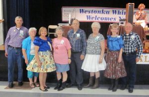 September 15, 2018 – Westonka Whirlers “Welcome to Fall” Square Dance, Mound, Caller Dick Rueter, Cuer Ken LaBau. Dancers from County Line Squares, Crystal Cross Trailers, Dakota Grand Squares, Single Circles, South Metro Stars, Spares & Pairs, and Westonka Whirlers were present. Also present were County Line Squares Queen Gael and King Doug, Spares & Pairs Queen Jennifer and King Barry, Westonka Whirlers Queen Anita and King Bill, SDM Vice Chair Barry Downs, SDM Treasurer Gael Zachman, SDM Executive Director LeRoy Elfmann, SDM Historian Al Martin, SDM Marketing Director Dee Scott, and SDM Membership Director Mary Kay Amberg. Spares & Pairs (see photo above) and County Line Squares claimed Westonka Whirlers banners (see photo below).