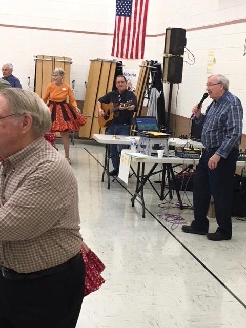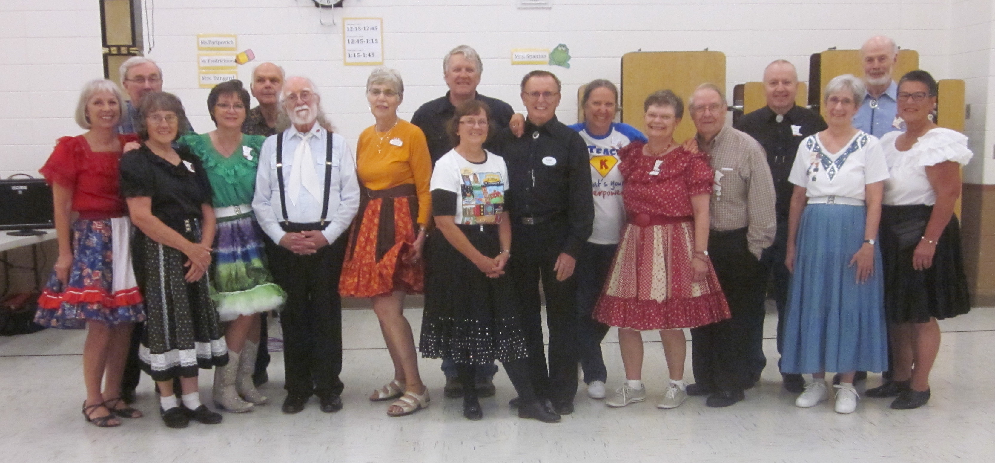 September 21, 2018 – Single Circles “Back to School” Square Dance, Maple Grove, Caller Dick Rueter, Cuer Jane Simpson. Dancers from Westonka Whirlers, Spares & Pairs, Single Circles, Hot Foot Stompers, First City Squares, Dakota Grand Squares, Crystal Cross Trailers, and County Line Squares were present. Also present were County Line Squares Queen Gael and King Doug, Hot Foot Stompers Queen Coni, SDM Treasurer Gael Zachman, SDM Executive Director LeRoy Elfmann, and SDM Historian Al Martin. County Line Squares retrieved their banner (see photo above) and Hot Foot Stompers claimed a Single Circles banner (see photo below).