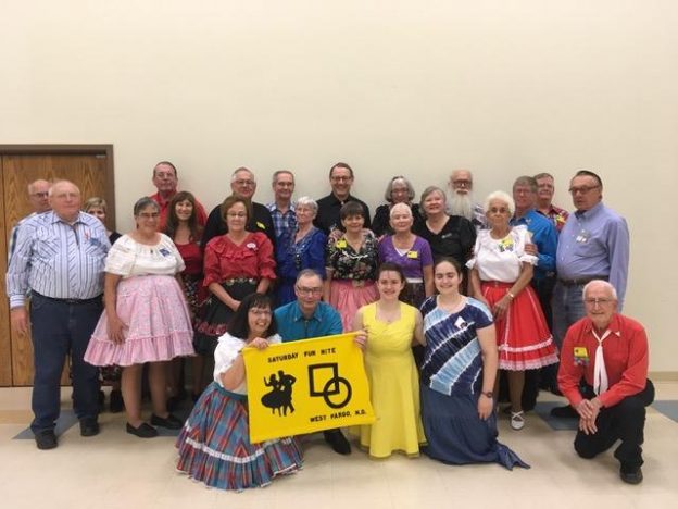 September 22, 2018 – Saturday Fun Nite Square Dance, Fargo, Caller Roger McNeil, Cuer Bernadette McNeil. Dancers were from Country Twirlers, Circle 8 Plus, Valley Stars, Hot Foot Stompers, L & M Squares, and Saturday Fun Nite. Front and center (holding the banner) are Gail and Dennis from Henryville, IN, who joined the dance. They are dancing in all 50 states and North Dakota was #36!!