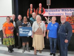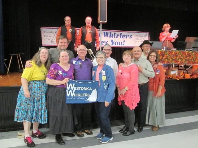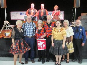 October 20, 2018 – Westonka Whirlers “Pumpkin Patch” Square Dance, Mound, Callers Don and Doug Sprosty, Cuer Doug Sprosty. Dakota Grand Squares (see photo below), Single Circles (see photo below), and Spares & Pairs (see photo above) claimed Westonka Whirlers banners. Hot Foot Stompers retrieved their banner (see photo below).