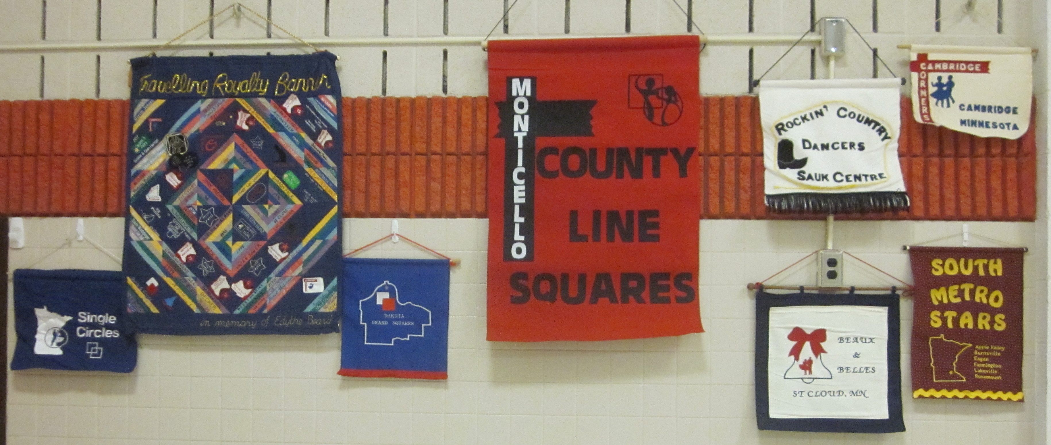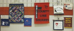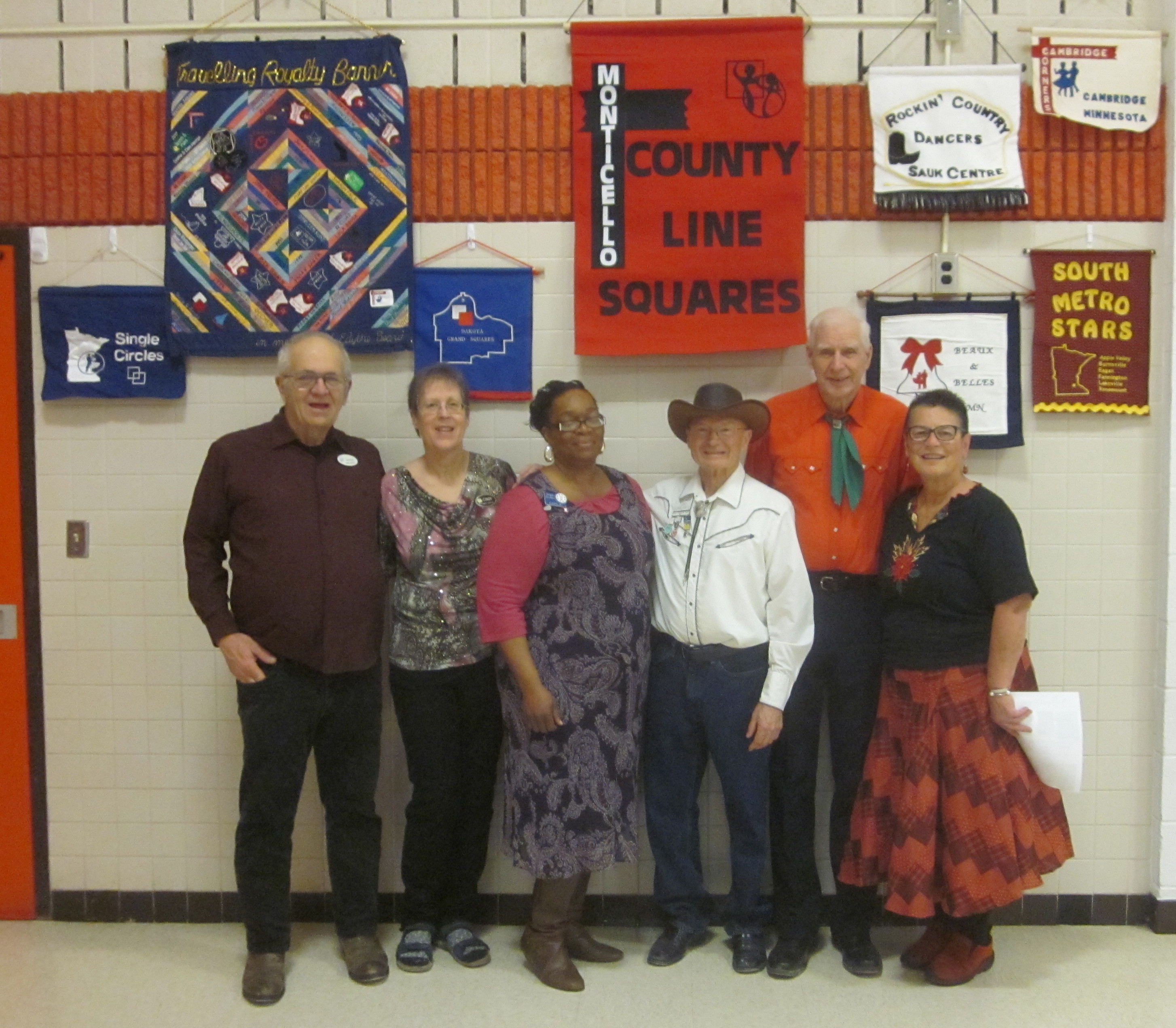 December 14, 2018 – County Line Squares “Winter Wonderland” Square Dance, Monticello, Caller Abe Maier, Cuer Jane Simpson. Dancers from Westonka Whirlers, Wadena Whirlaways, Triple T, Single Circles, Koronis Nite Owls, Jolly Promenaders, Hot Foot Stompers, and Cambridge Corners joined the County Line Squares dancers. County Line Squares Queen Gael and King Doug, SDM Treasurer Gael Zachman, SDM Executive Director LeRoy Elfmann, and SDM Marketing Director Dee Scott were present. Koronis Nite Owls claimed a County Line Squares banner (see photo above).