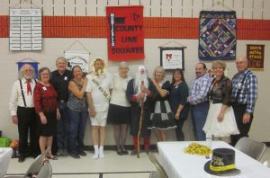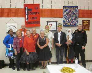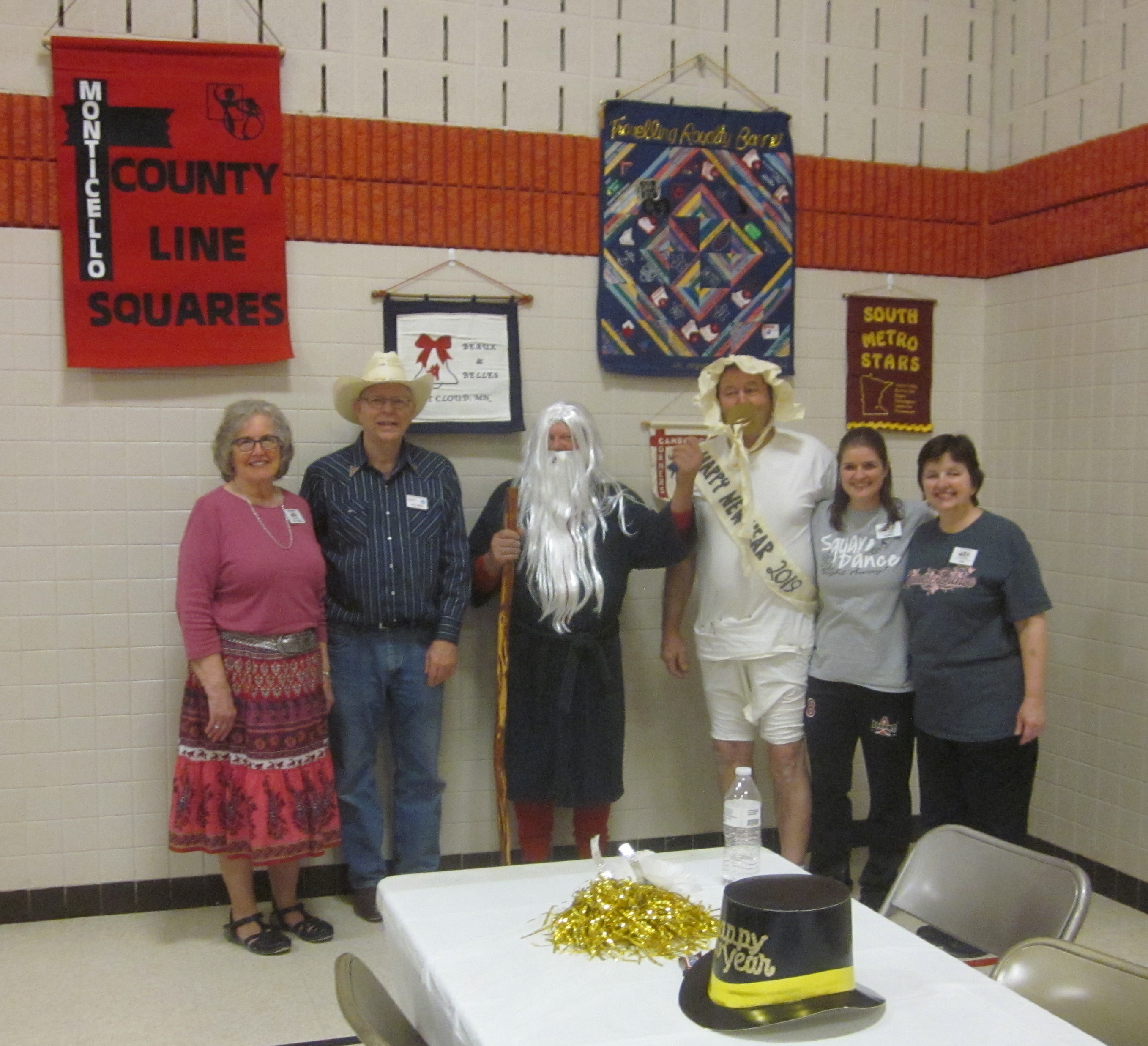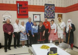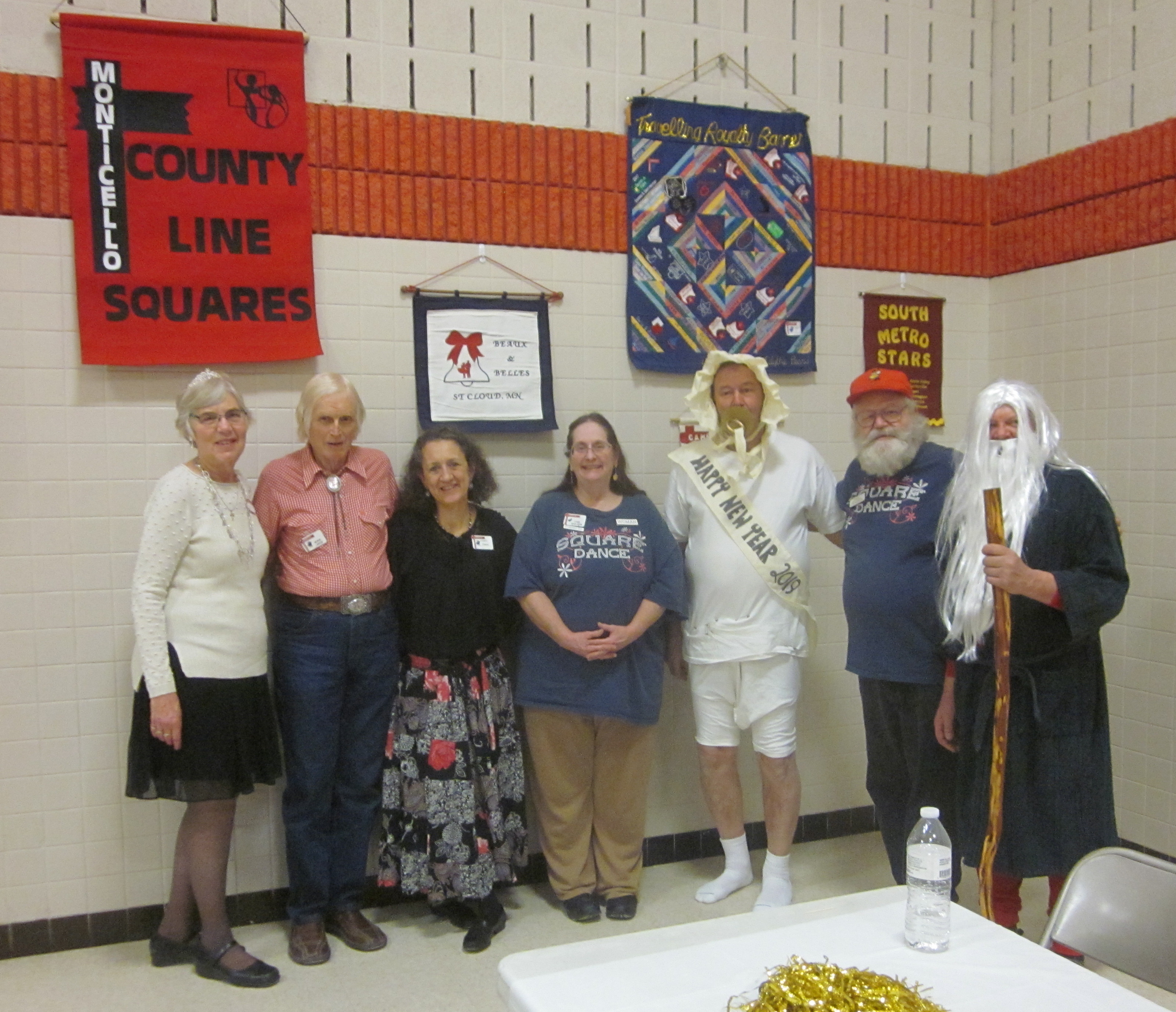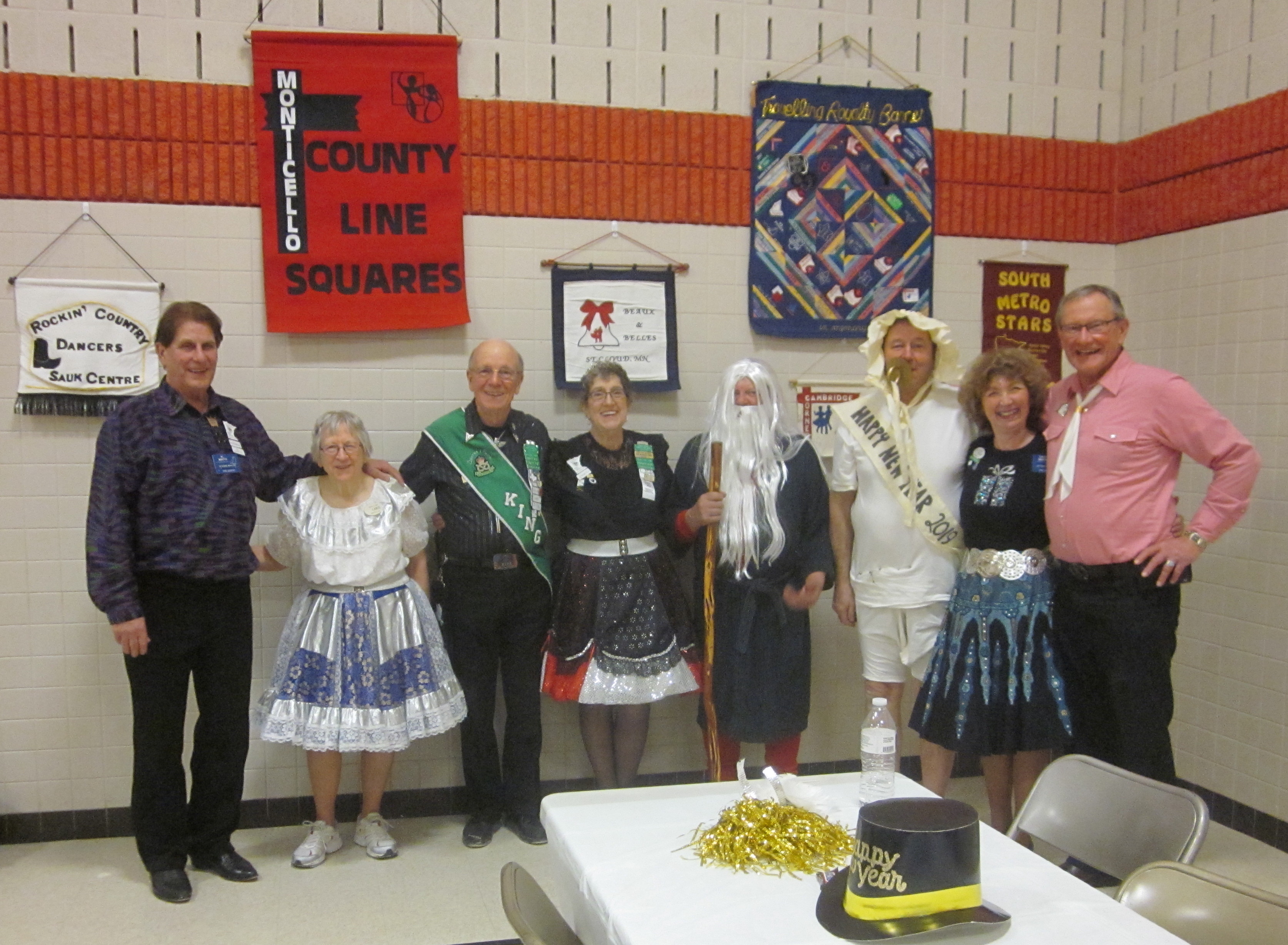 December 31, 2018 – January 1, 2019 – County Line Squares “New Year’s Eve – Holiday Glitter” Square Dance, Monticello, Caller Abe Maier, Guest Caller Tom Allen, Cuer Jane Simpson. Dancers from Ar-Dale Dancers, Beaux & Belles, Cambridge Corners, Dakota Grand Squares, ETTA Square & Rounds, Hot Foot Stompers, Single Circles, Spares & Pairs, Triple T, and Westonka Whirlers joined County Line Squares. Many “new dancers” were present, as were Ar-Dale Dancers Queen Tami and King Rick, County Line Squares Queen Gael and King Doug, Hot Foot Stompers Queen Coni, Spares & Pairs Queen Jennifer and King Barry, Westonka Whirlers Queen Anita and King Bill, SDM Vice Chair Barry Downs, SDM Treasurer Gael Zachman, SDM Executive Director LeRoy Elfmann, SDM Historian Al Martin, RoundUp Assistant Editor Steve Huntsman, RoundUp Advertising Manager Connie Walker-Pearson, and RoundUp Subscription Manager and Enhancin’ Dancin’ Editor Paul Pearson. Beaux & Belles (see photo above) and Single Circles retrieved their banners; Hot Foot Stompers already had a County Line Squares banner.