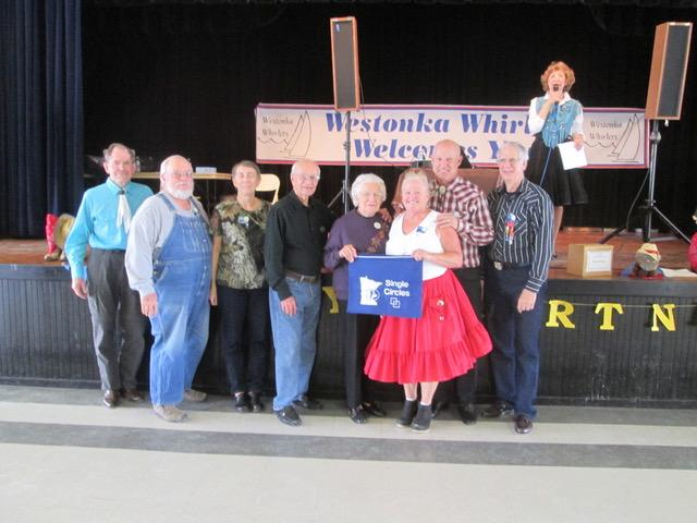 February 17, 2019 – Westonka Whirlers “Home on the Range” Square Dance, Mound, Caller Tom Allen, Cuer Sarah Klaphake. Ar-Dale Dancers, Beaux & Belles, County Line Squares, Dakota Grand Squares, Hot Foot Stompers, Single Circles, South Metro Stars, Spares & Pairs, and Wandering Wheels danced with Westonka Whirlers. Dakota Grand Squares Queen Rose Marie and King John, Spares & Pairs Queen Jennifer and King Barry, Come Square Dance Chair Vince Dahlheimer, Square Dance Minnesota (SDM) Vice Chair Barry Downs, SDM Executive Director LeRoy Elfmann, SDM Historian Al Martin, SDM Marketing Director Dee Scott, and SDM Membership Director Mary Kay Amberg were present. Spares & Pairs claimed a Westonka Whirlers banner (see photo above) and Single Circles retrieved their banner (see photo below).