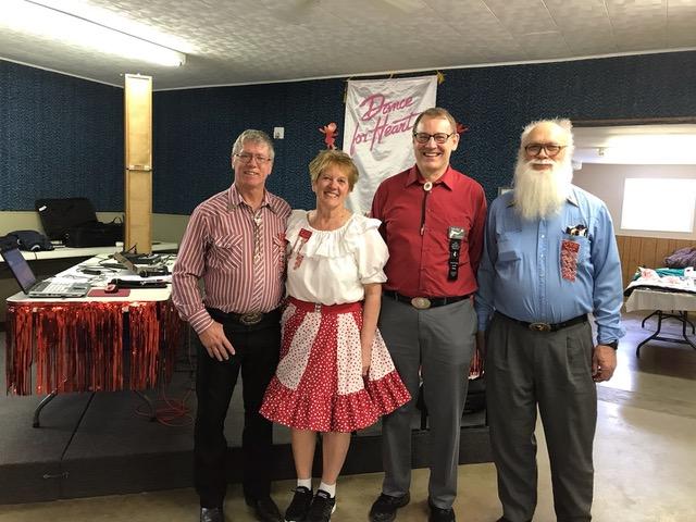 April 7, 2019 – Northern Minnesota Square Dance for Heart, Waubun, Callers Roger McNeil, Charley Huhtala and Mark Helfter, Cuer Bernadette McNeil. Jessica from the American Heart Association accepting a check (see photo above) in the amount of $2,727.00 which were the proceeds from the benefit held by the Northwest Region. Over seven squares of dancers raised the funds through donations, silent auction, and dinner.