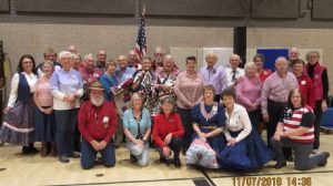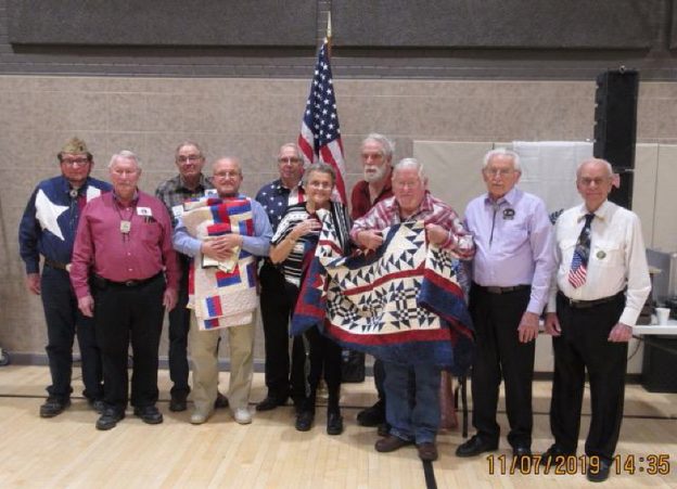 November 7, 2019 – Afternoon Squares “Salute to Vets” Square Dance, Hopkins, Caller Abe Maier. Some of the veterans (see photo above) at the luncheon, with quilts handmade by volunteers from Quilts of Valor.