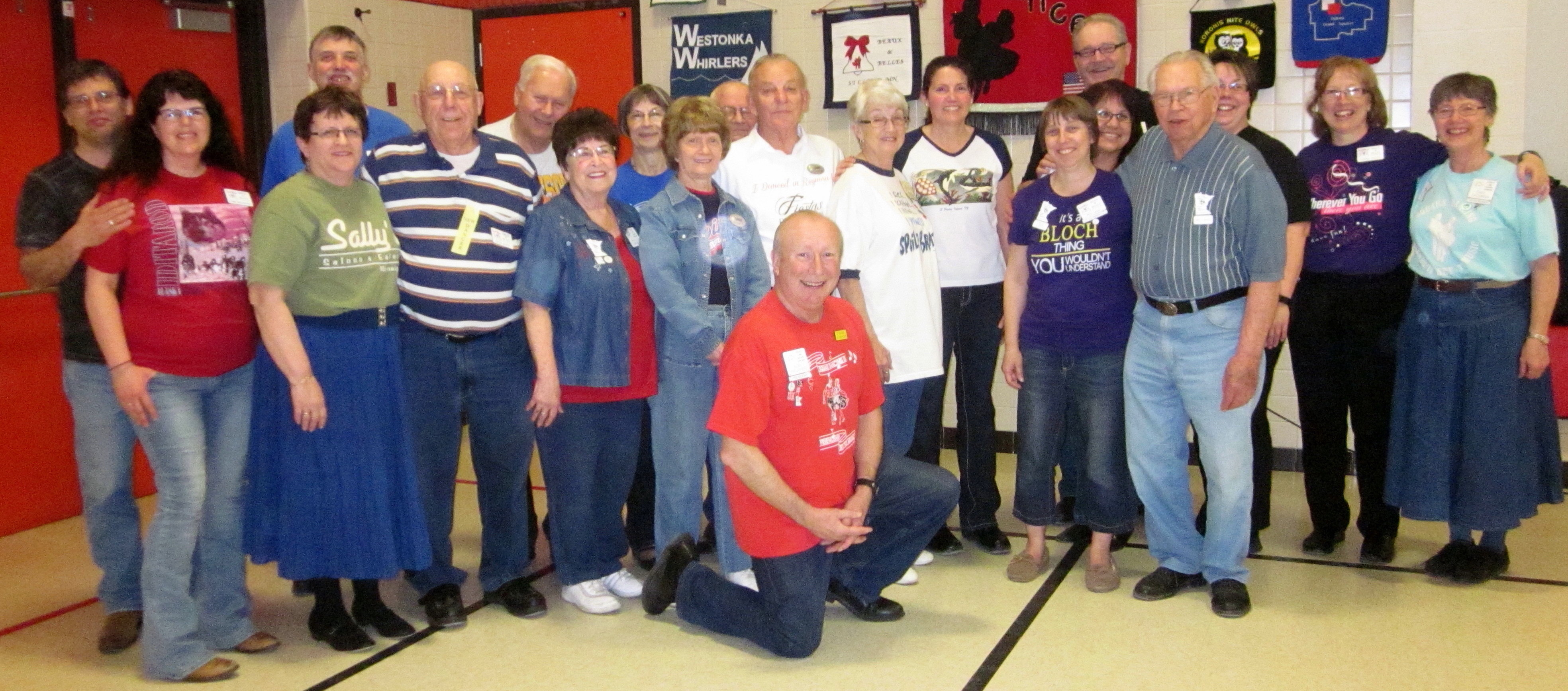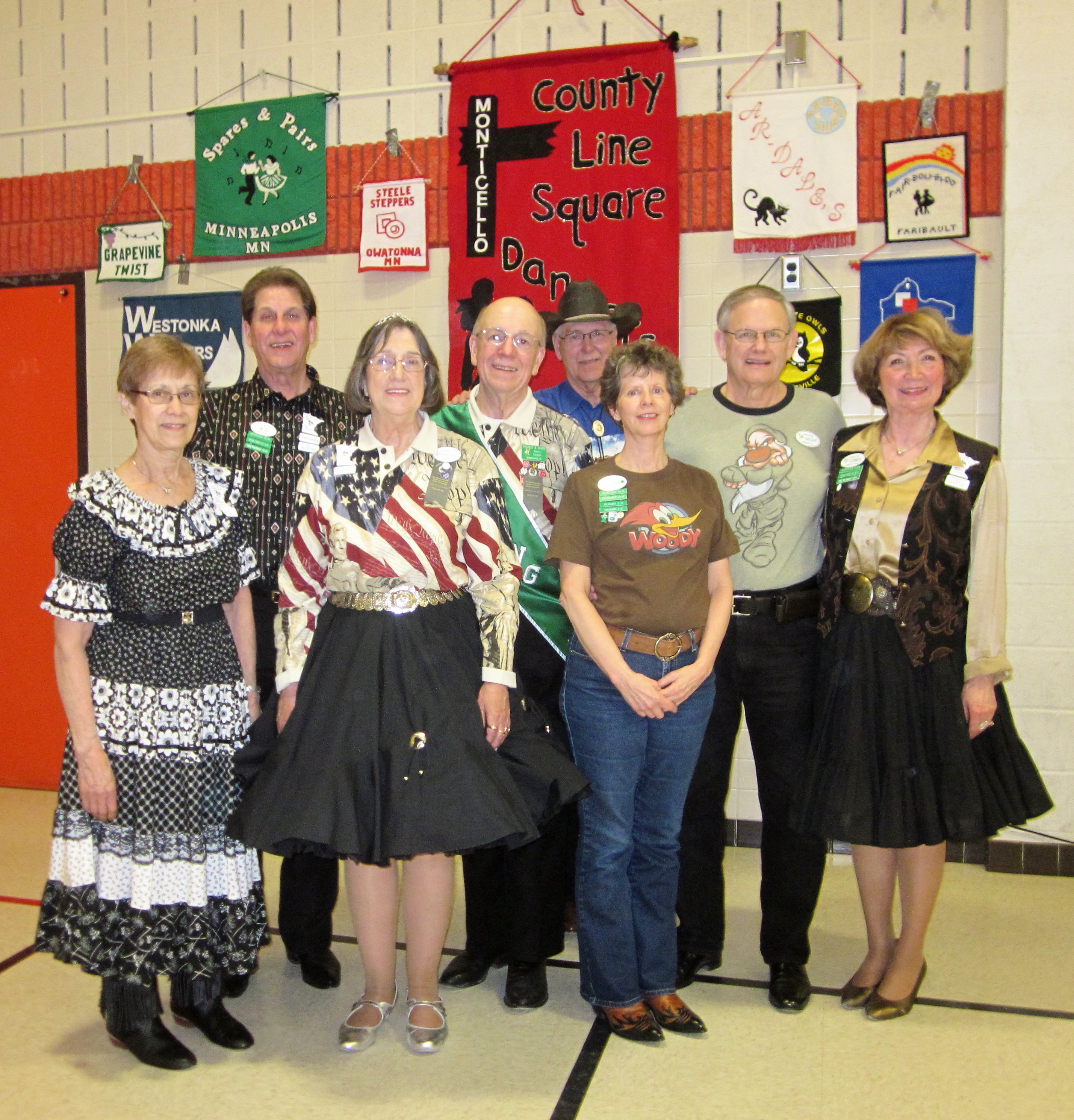 April 10, 2015 – County Line Squares “T-Shirt Night” Square Dance, Monticello, Caller Tom Allen, Cuer Sarah Klaphake. Ten squares with dancers from Westonka Whirlers, Single Circles, Spares & Pairs, Wandering Wheels, Darcy Dandies, Hotfoot Stompers, and County Line Squares were present. Queen Adrienne was crowned by Queen Mavis. Other royalty in attendance were Queen Jennifer and King Barry from Spares & Pairs and Queen Journey from Single Circles. Also attending were SDM Vice Chair Don Hanson, SDM Secretary Bob Meyer, SDM Treasurer Deb Hollimon, SDM Historian Al Martin, and Come Square Dance President Vince Dahlheimer. Guests visiting from Nebraska were Gary and Shirley Gillard from Darcy Dandies. Beaux & Belles and Spares & Pairs retrieved their banners.