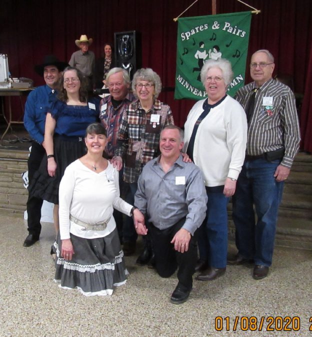 January 8, 2020 – Spares & Pairs Square Dance, Bloomington, Caller Larry Fruetel, Cuer Sarah Klaphake. County Line Squares retrieved their banner (see photo above).
