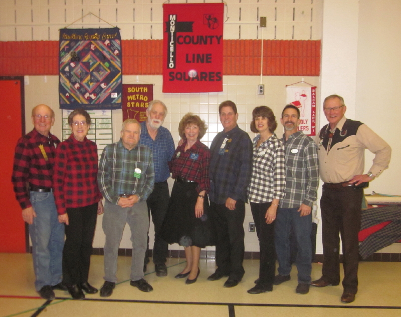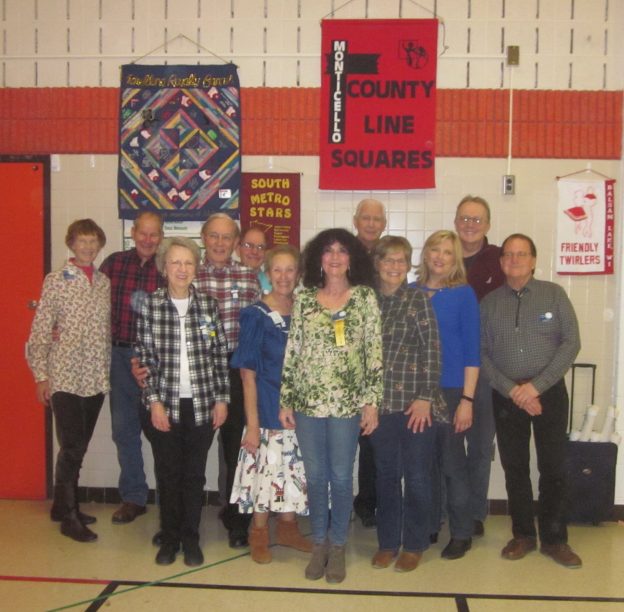 January 10, 2020 – County Line Squares “Flannel Fling” Square Dance, Monticello, Caller Larry Fruetel, Cuer Ken LaBau. Dancers from Ar-Dale Dancers, Beaux & Belles, Cambridge Corners, County Line Squares, Dude’s ‘n’ Dolls (Great Falls, MT), Gospel Plus, Hot Foot Stompers, Single Circles, Spares & Pairs, and Westonka Whirlers were present. Also present were Ar-Dale Dancers Queen Kathleen, County Line Squares Queen Carmen, Come Square Dance Chair Vince Dahlheimer, SDM Chair Barry Downs, SDM Vice Chair LeRoy Elfmann, SDM Historian Al Martin, and SDM Marketing Director Dee Scott. Single Circles (see photo above) and Spares & Pairs (see photo below) claimed County Line Squares banners.