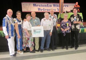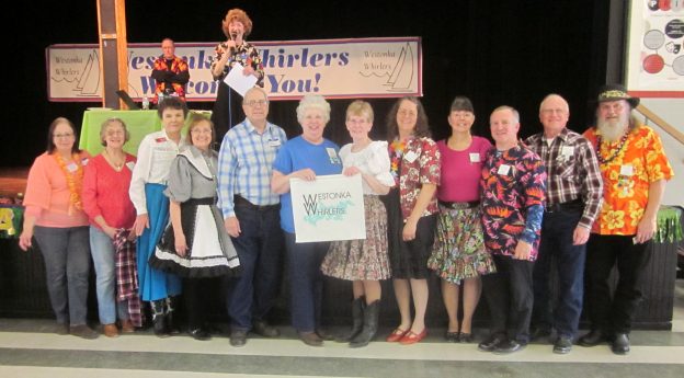 February 16, 2020 – Westonka Whirlers “Hawaiian Luau” Square Dance, Mound, Caller Tom Allen, Cuer Sarah Klaphake. Dancers from Beaux & Belles, County Line Squares (see photo above), Crystal Cross Trailers, Dakota Squares, Hotfoot Stompers, Single Circles, TMF Squares, Single Circles, Spares & Pairs, Wandering Wheels, and Westonka Whirlers were present. Also present were County Line Squares Queen Carmen, Dakota Squares Queen Becky and King Jeff, Westonka Whirlers Queen Debbie, SDM Chair Barry Downs, SDM Vice Chair LeRoy Elfmann, SDM Historian Al Martin, SDM Marketing Director Dee Scott, and SDM Membership Director Mary Kay Amberg.
