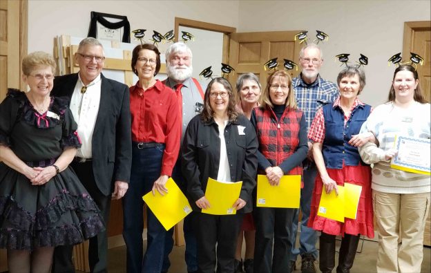 February 13, 2020 – Wadena Whirlaways “Graduation” Square Dance, Wadena. Seven of nine new dancers appear in the photo above with Caller Larry Johansen.