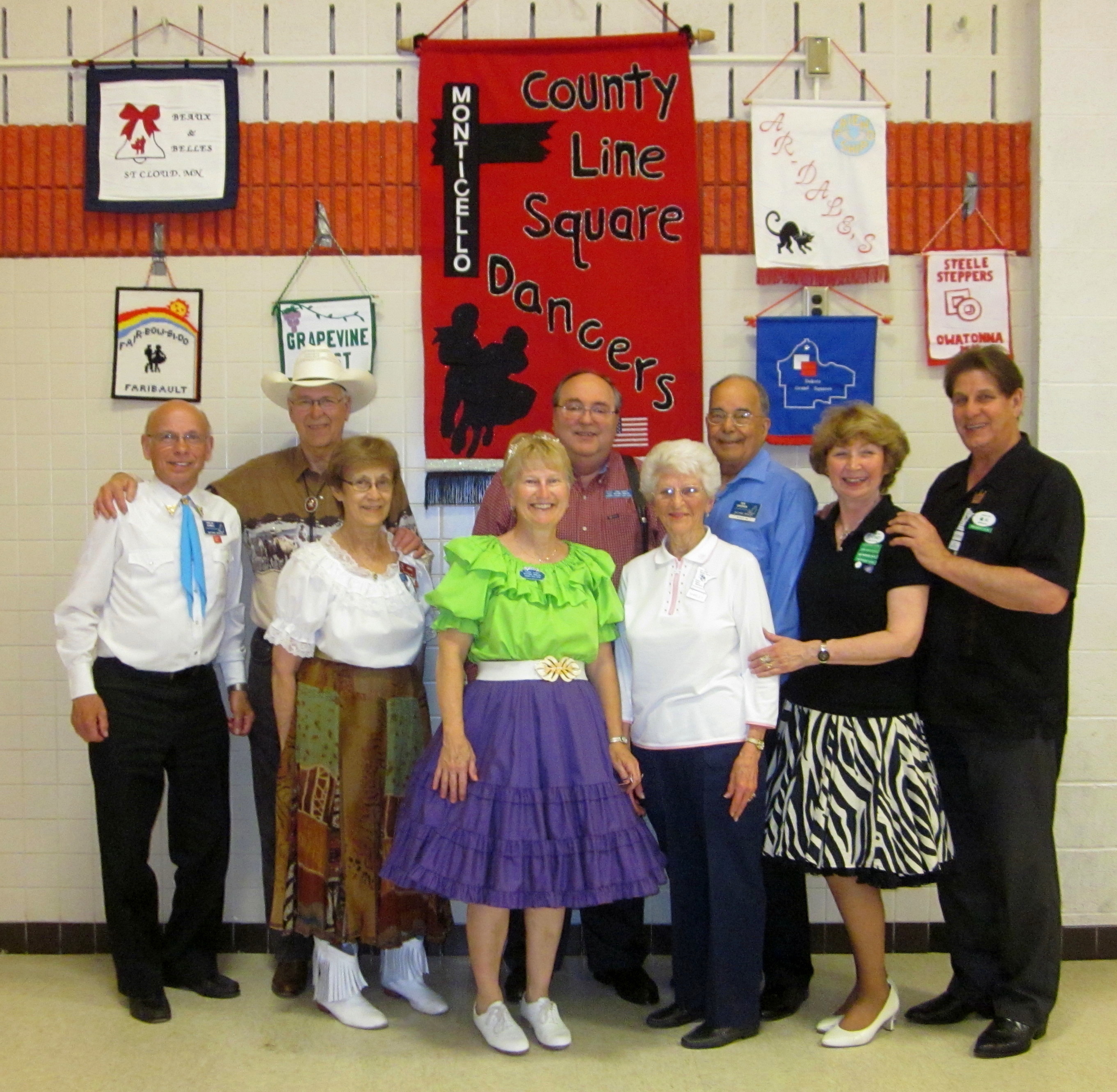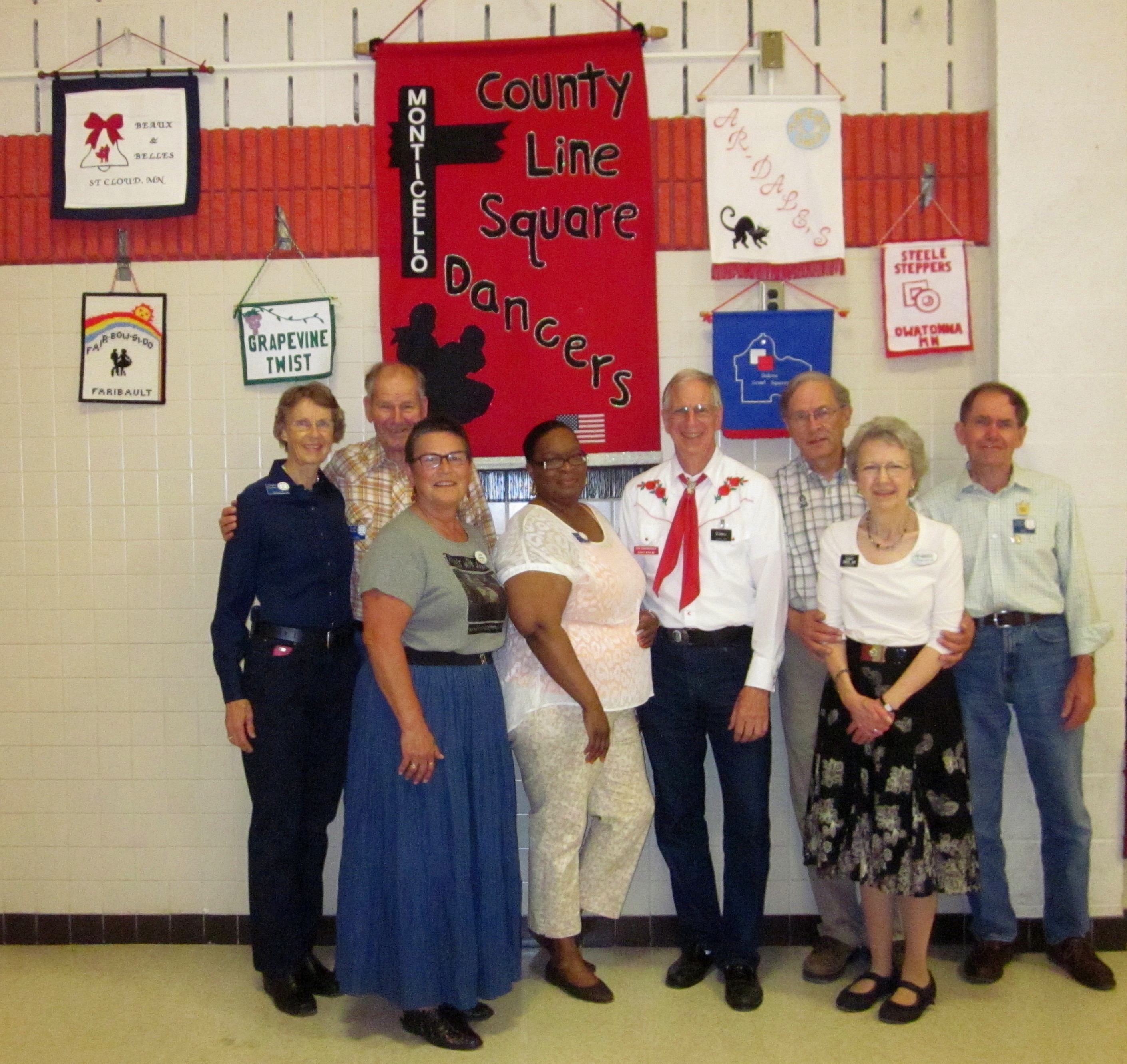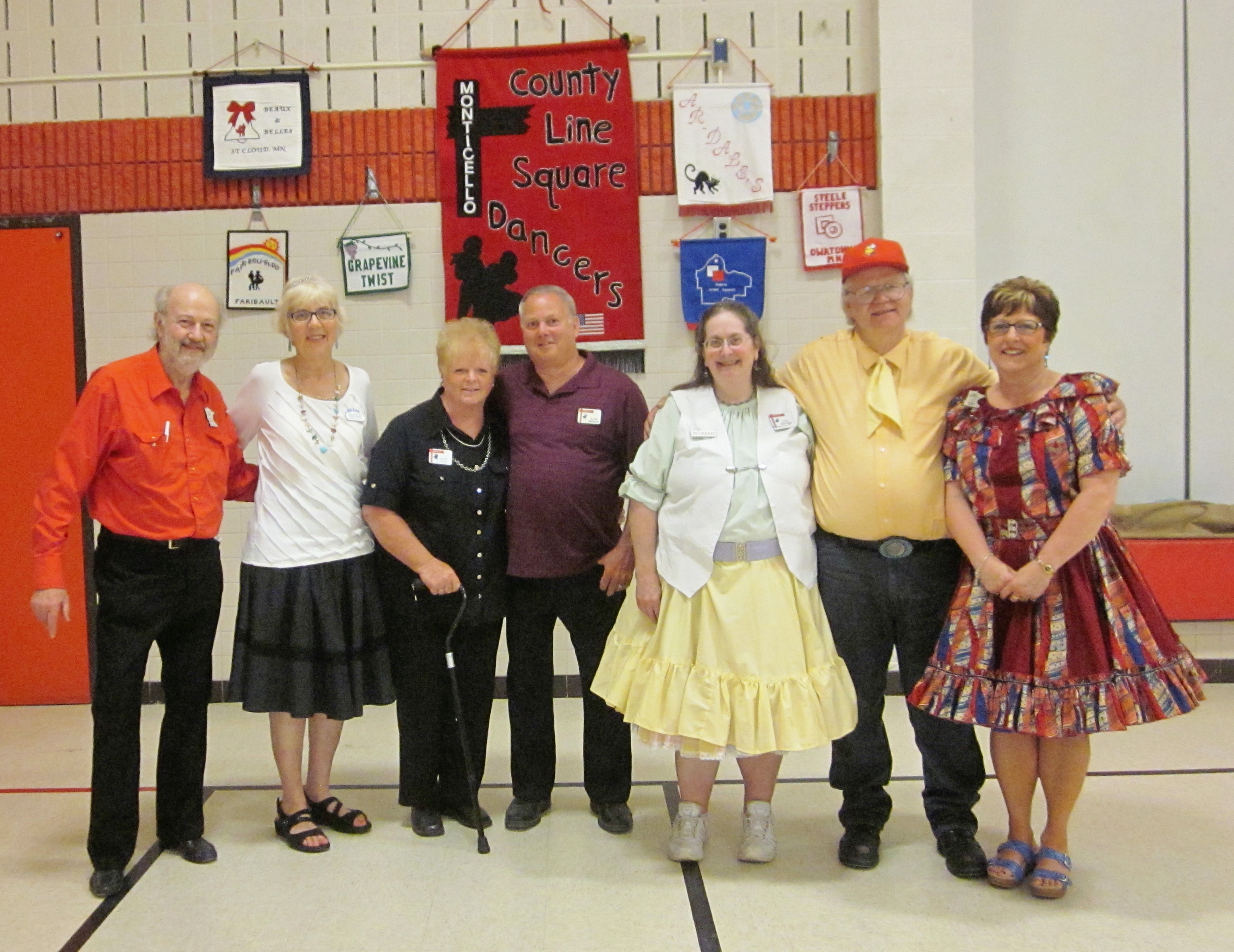 May 29, 2015 – County Line Squares “Convention Bound” Square Dance, Monticello, Caller Abe Maier, Guest Cuer Jane Simpson. Eight squares from eight organizations (Cambridge Corners, County Line Squares, Dan’se PAC, Hotfoot Stompers, Rum River Squares, Single Circles, Spares & Pairs, and Westonka Whirlers were represented. Cambridge Corners Queen Coni, Westonka Whirlers Queen Debbie, and County Line Squares Queen Adrienne were in attendance. Also attending were Square Dance Minnesota Vice Chair Don Hanson, Secretary Bob Meyer, and Historians Al and Cindy Martin as well as the Federation Roundup’s Subscription Manager and Enhancin’ Dancin’ Editor Paul Pearson.