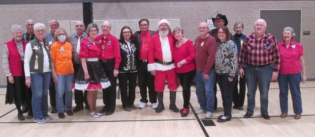December 16, 2021 – Afternoon Squares Square Dance, Hopkins, Caller Abe Maier. Two squares celebrated the season with Abe and Carol (see photo above).