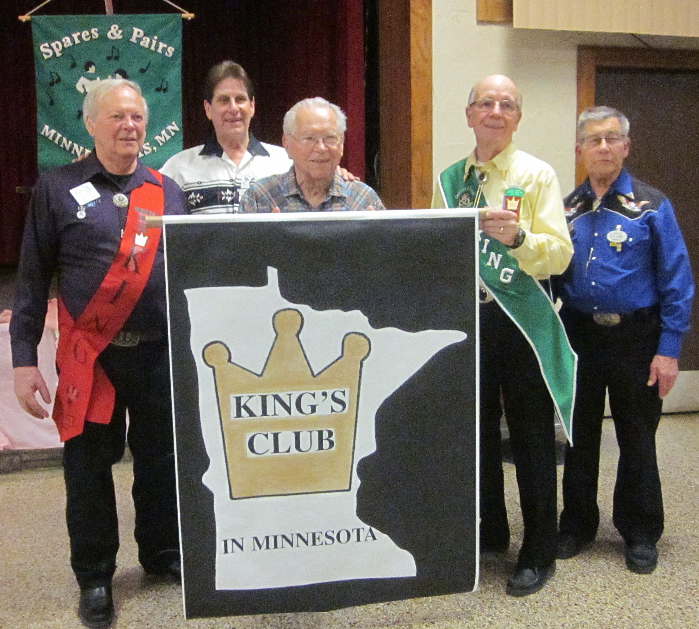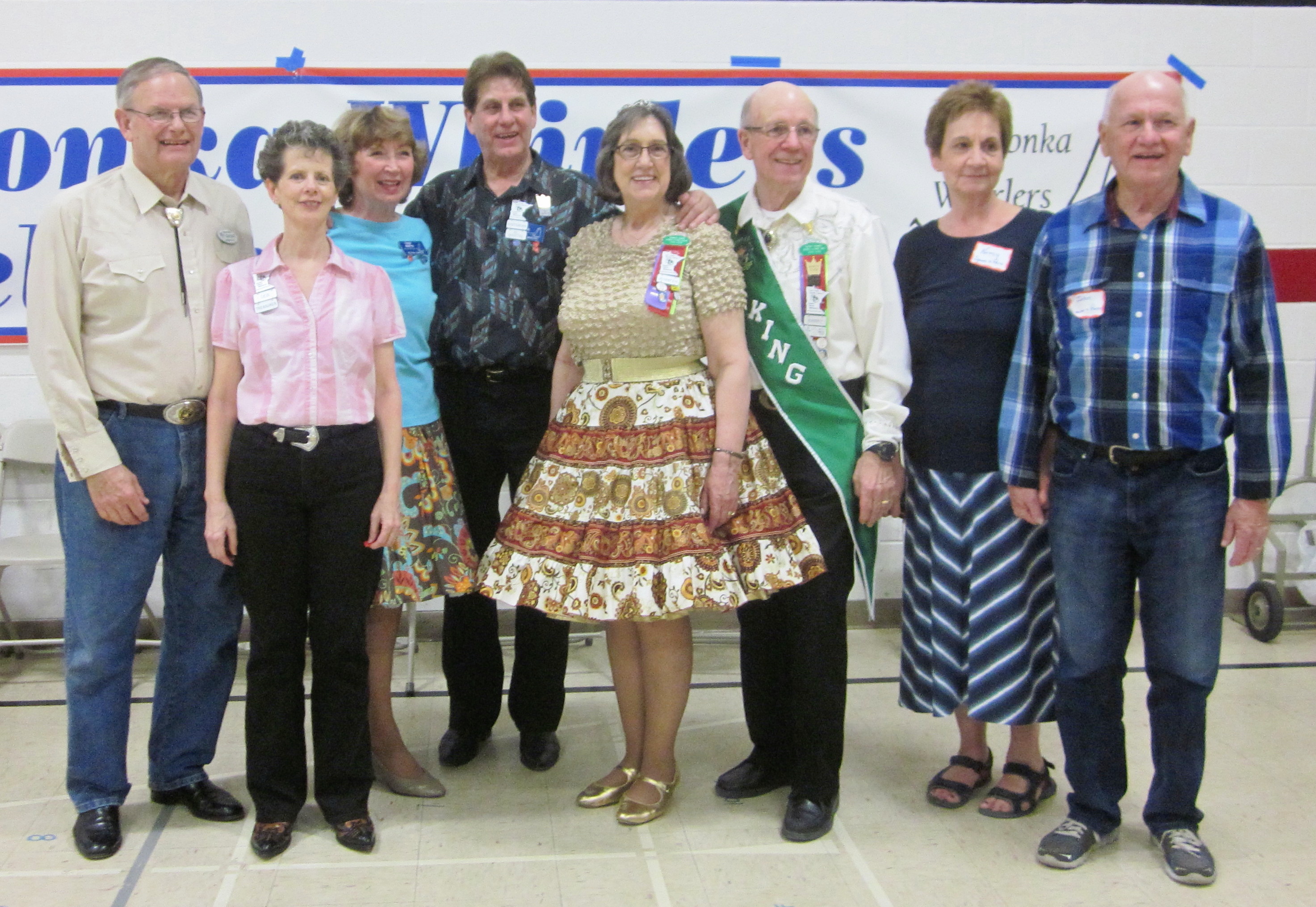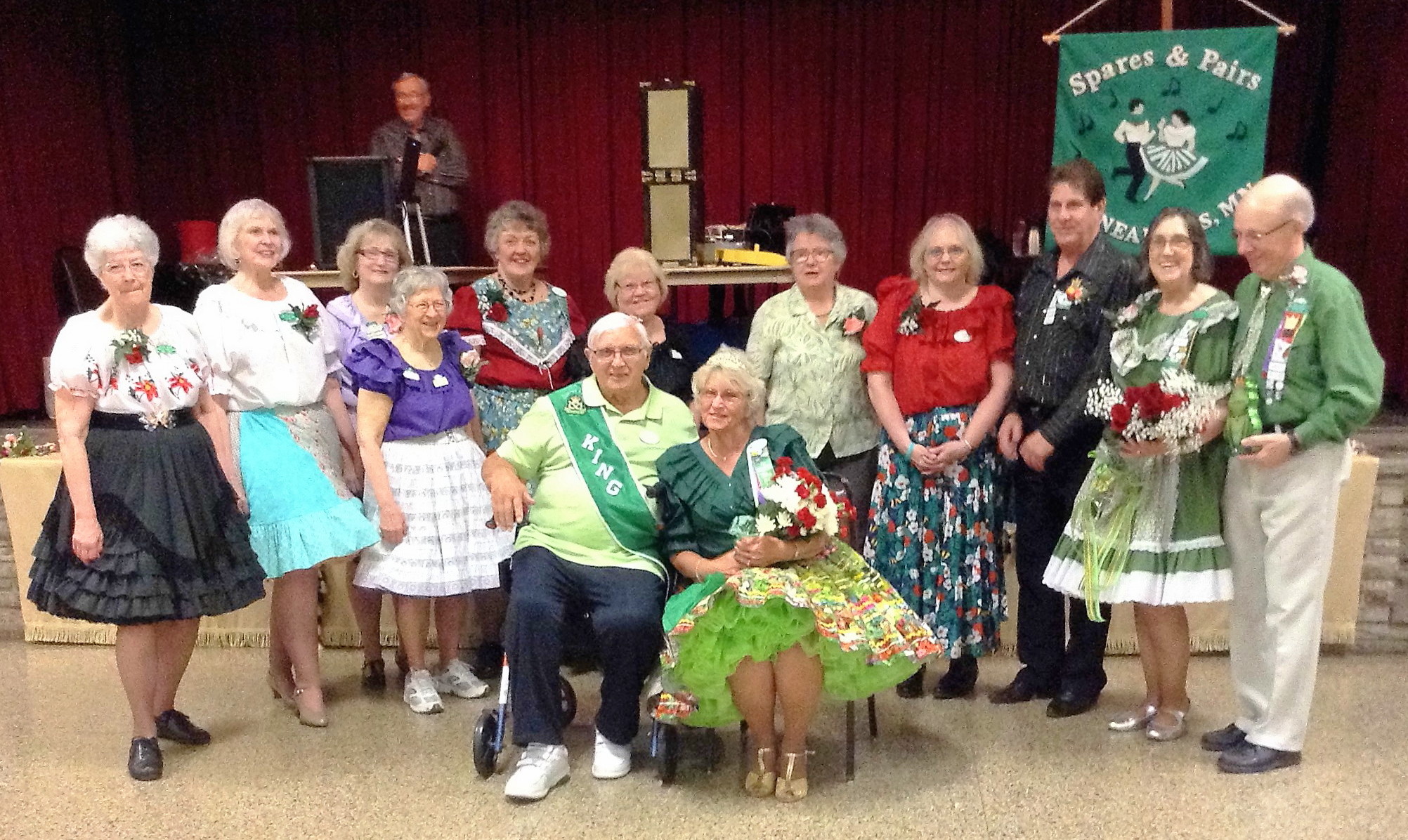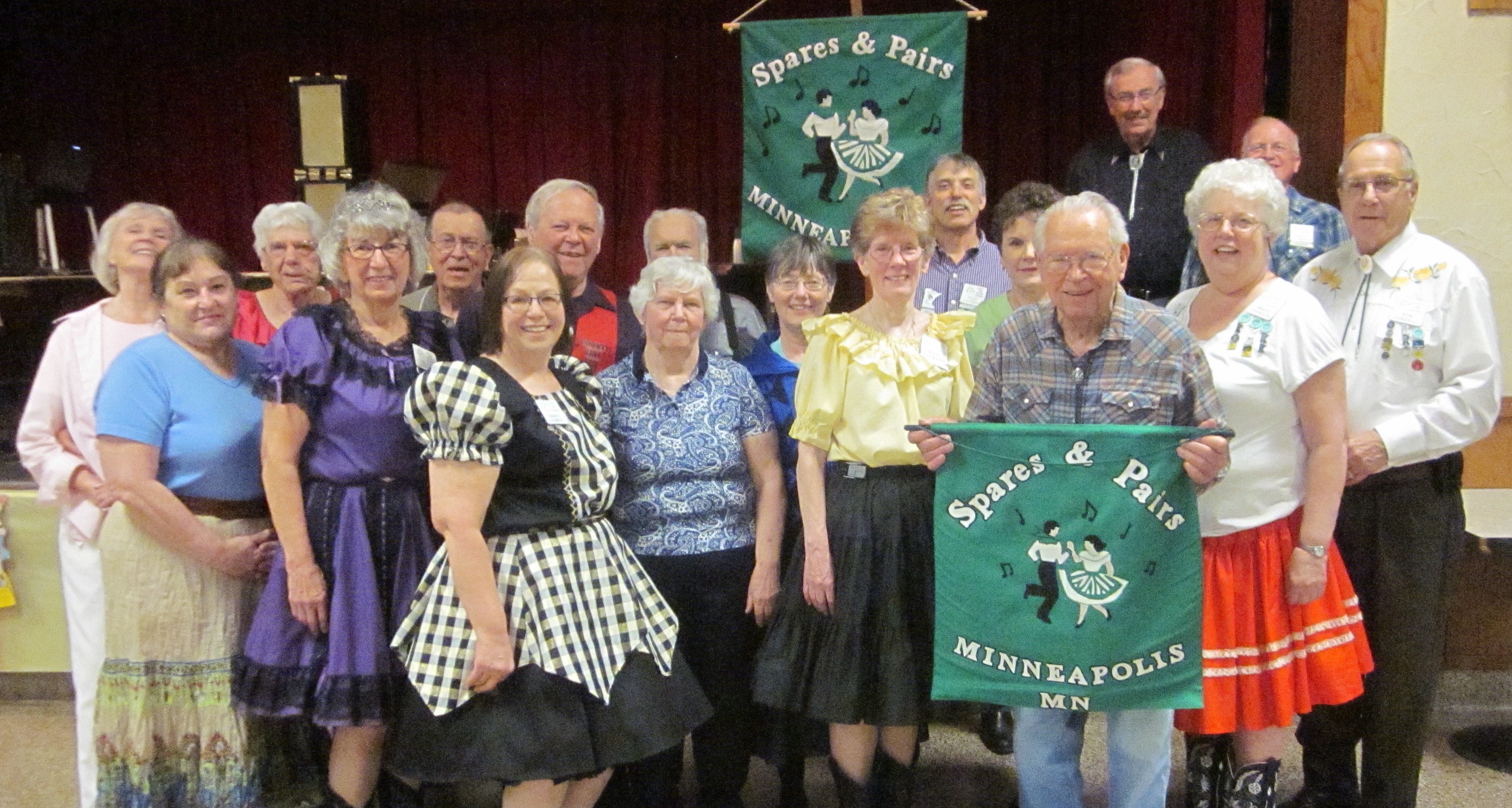 April 13, 2016 – Spares & Pairs Square Dance, Bloomington, Caller Dick Rueter, Cuers Jean and Steve Philson.  Seven squares from five organizations were present.  Attending the dance were County Line Squares Queen Helen and King Steve and Spares & Pairs Queen Jennifer and King Barry, SDM Chair LeRoy Elfmann, SDM Vice Chair Don Hanson, SDM Treasurer Deb Hollimon, and SDM Historian Al Martin.  County Line Squares claimed a large Spares & Pairs banner.