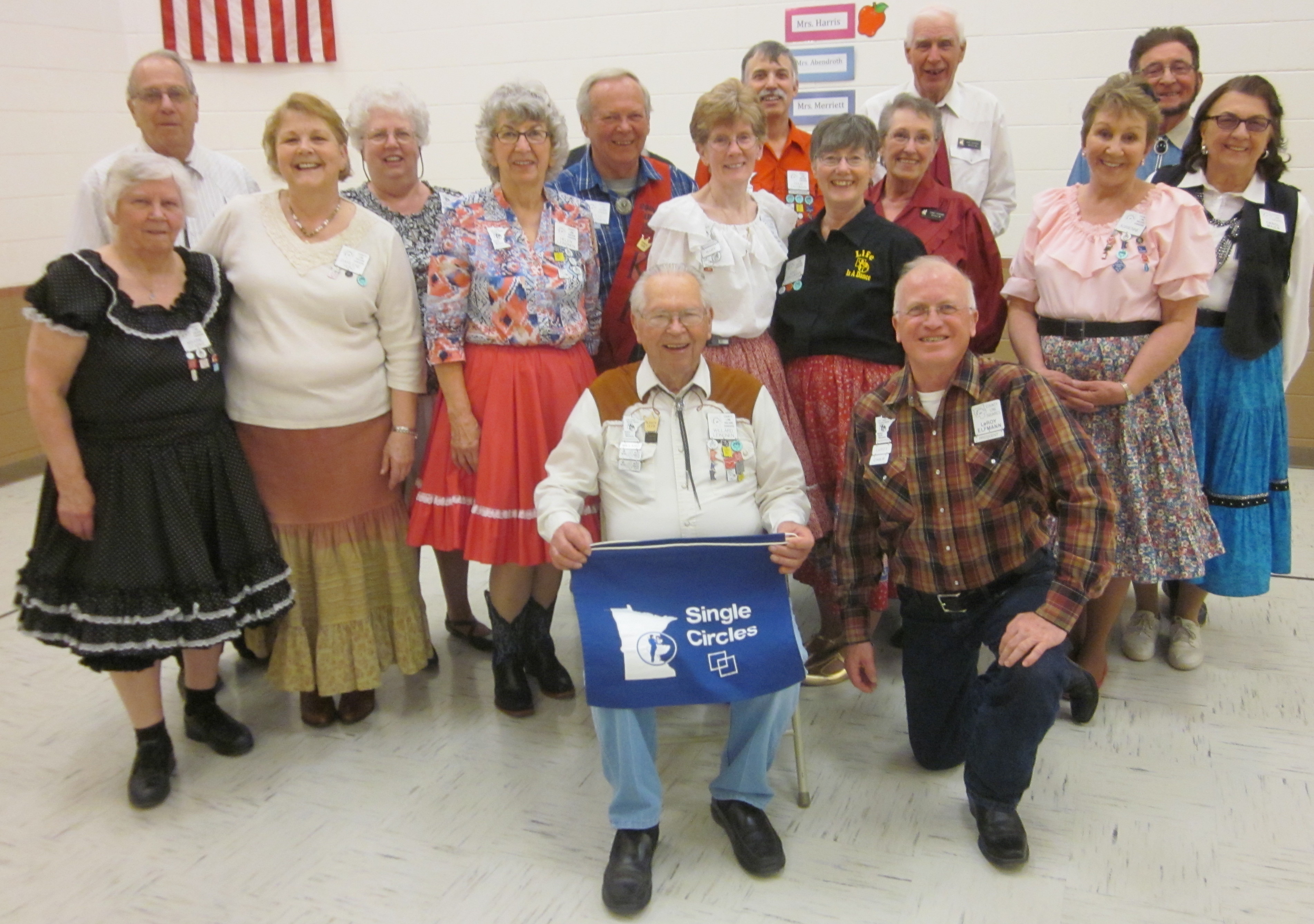 April 15, 2016 – Single Circles “Everything’s Coming Up Roses” Square Dance, Maple Grove, Caller Abe Maier, Cuer Ken LaBau.  Five squares with dancers from seven organizations were present.  Also present were Single Circles Queen Journey and County Line Squares Queen Helen and King Steve, SDM Chair LeRoy Elfmann, and SDM Historian Al Martin.  County Line Squares claimed a Single Circles banner.