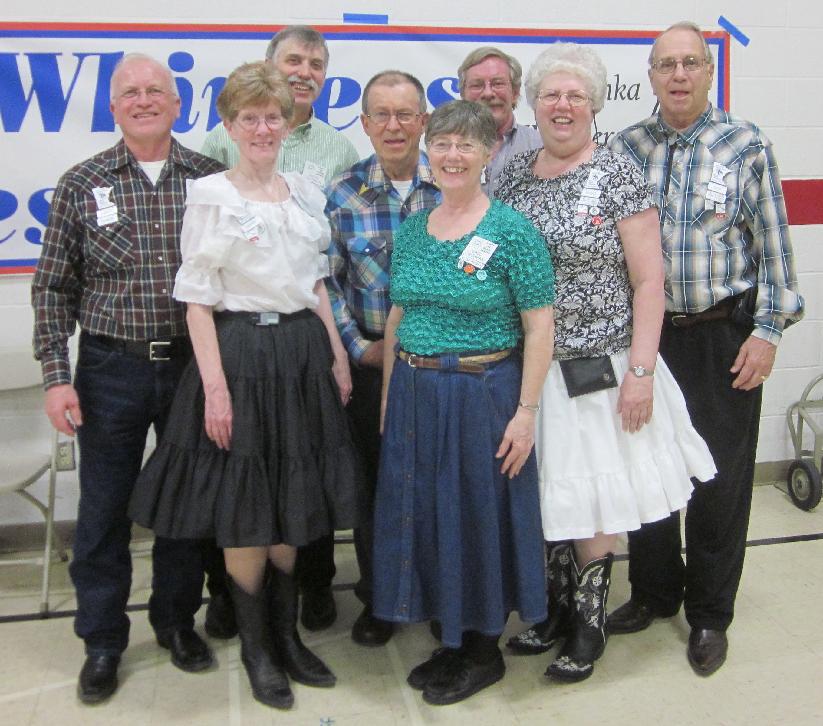 April 16, 2016 – Westonka Whirlers “Hello Spring!” Square Dance, Mound, Callers Dick Rueter and Tom Allen, Cuer Ray Belanger.  Eight squares with dancers from 12 organizations were present.  Spares & Pairs claimed a Westonka Whirlers banner and Hot Foot Stompers retrieved their banner.