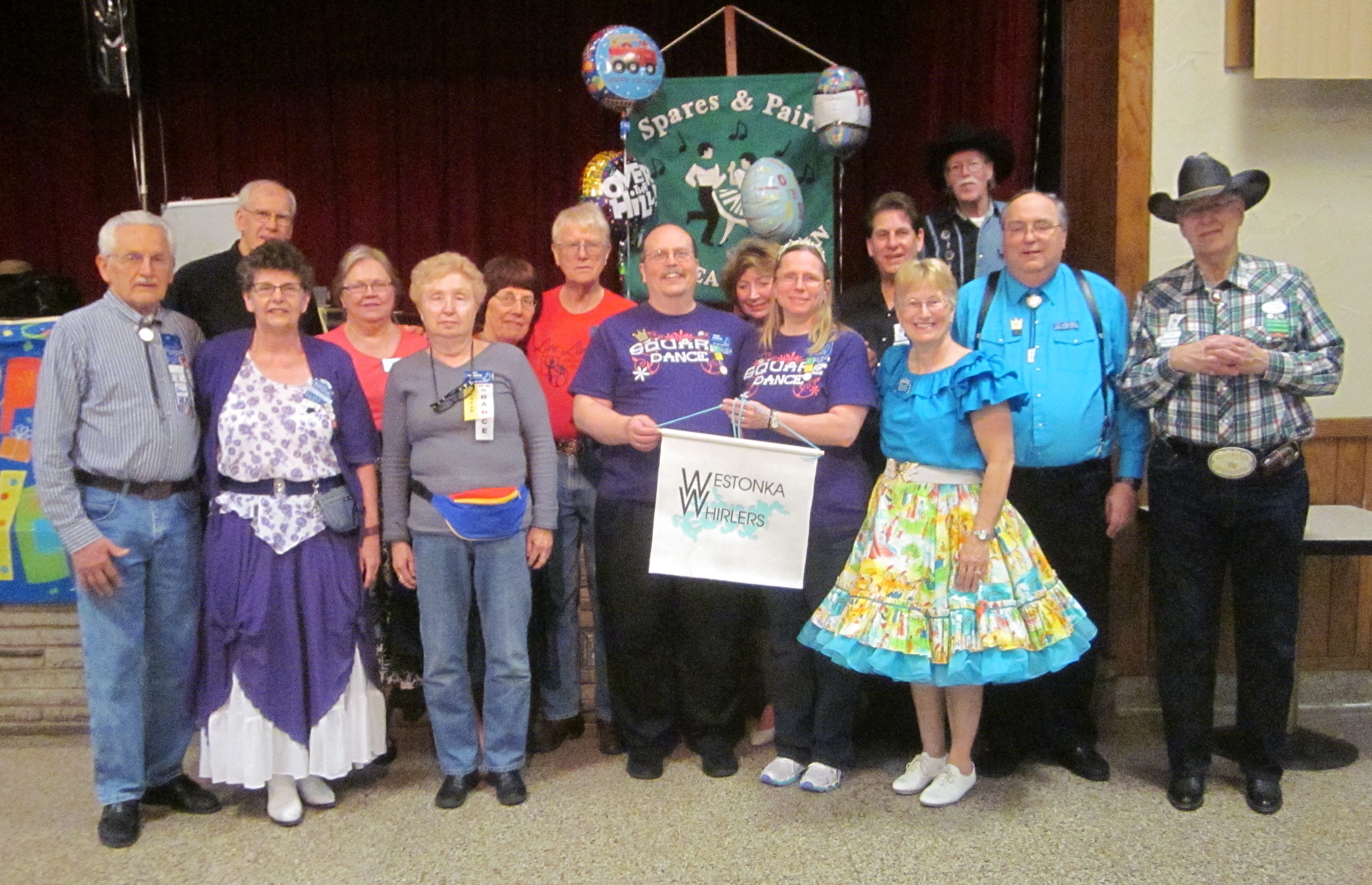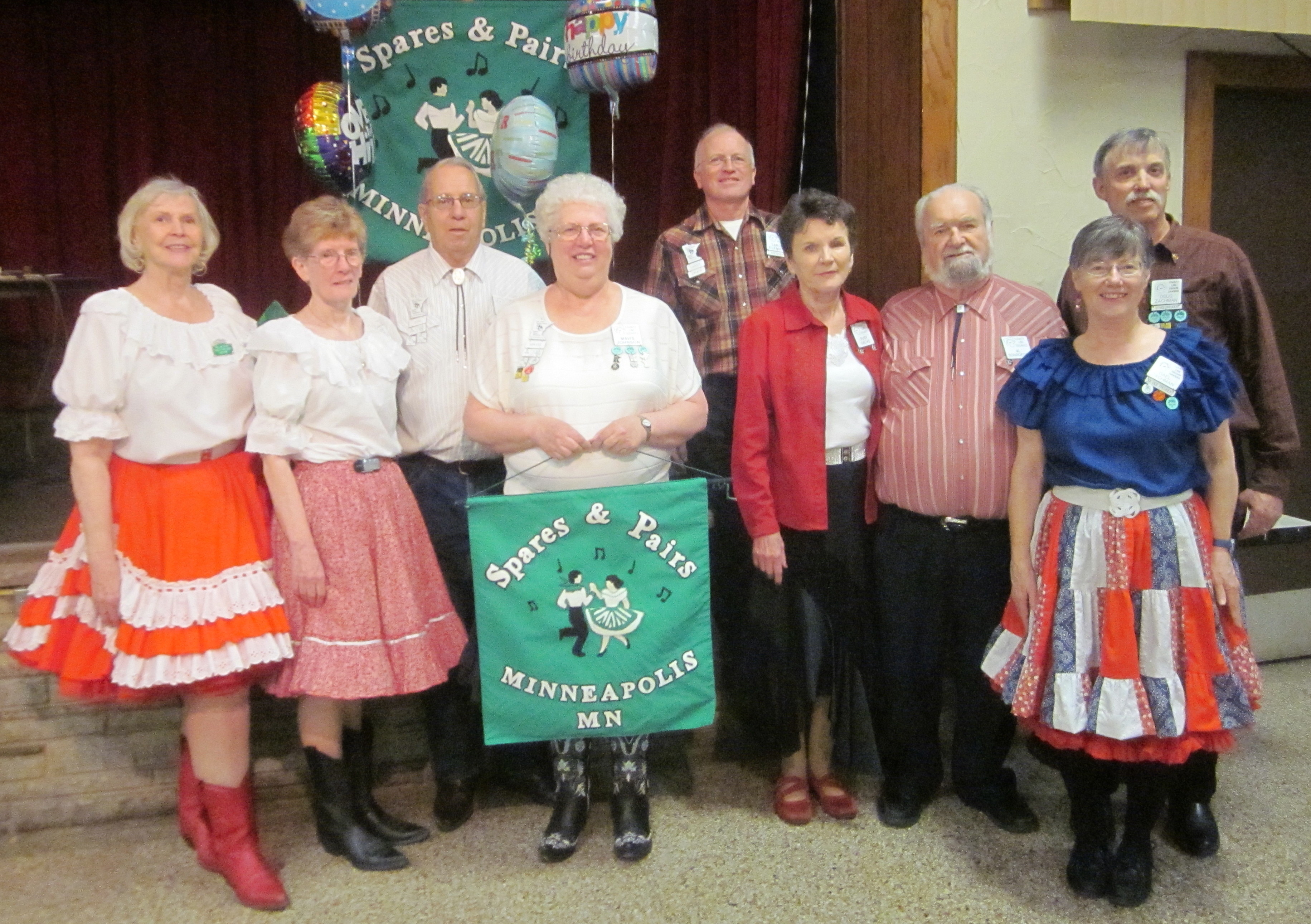 March 30, 2016 – Spares & Pairs Square Dance, Bloomington, Caller Larry Fruetel, Cuer Ray Belanger. Nine squares with dancers from eight organizations were present. Attending were Spares & Pairs Queen Jennifer and King Barry, Westonka Whirlers Queen Jenny and King Randy, Ar-Dale Dancers Queen Bonnie, SDM Chair LeRoy Elfmann, SDM Vice Chair Don Hanson, SDM Treasurer Deb Hollimon, and SDM Historian Al Martin. Ar-Dale Dancers and Westonka Whirlers retrieved their banners. County Line Squares claimed a Spares & Pairs banner.
