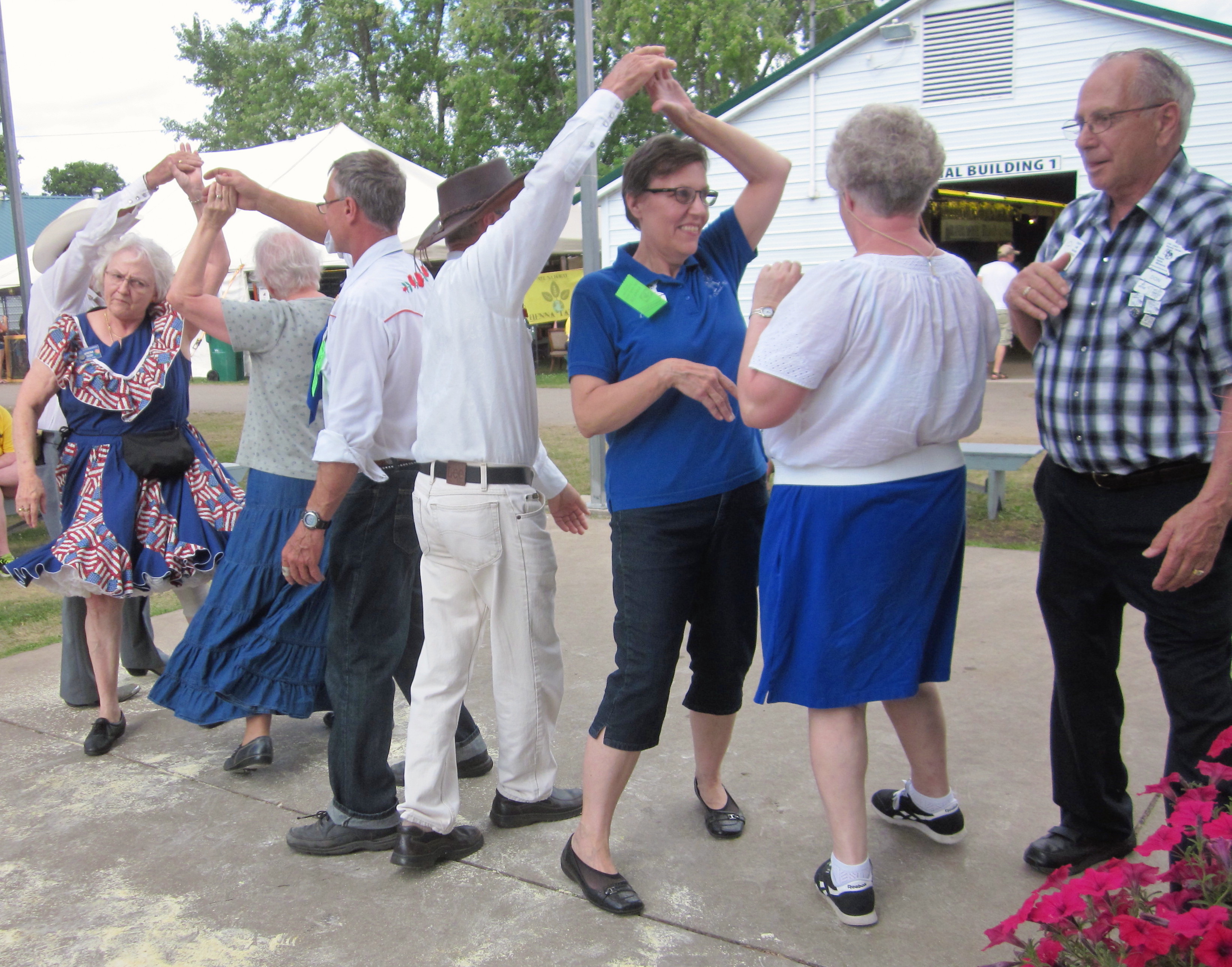 August 8, 2015 – Crow Wing County Fair Demo, Brainerd, Caller Abe Maier. Four squares with participants from Wadena Whirlaways, Rays Promenaders, North Country Plus, and County Line Squares were present and assisted many new dancers from the audience.