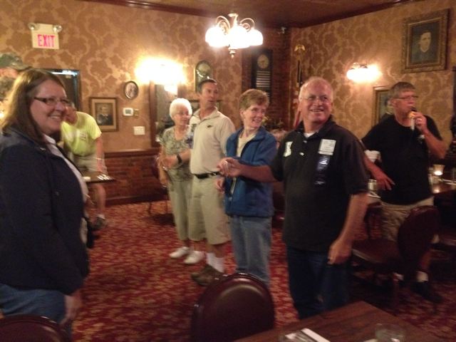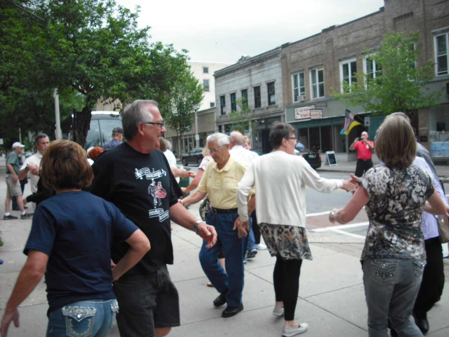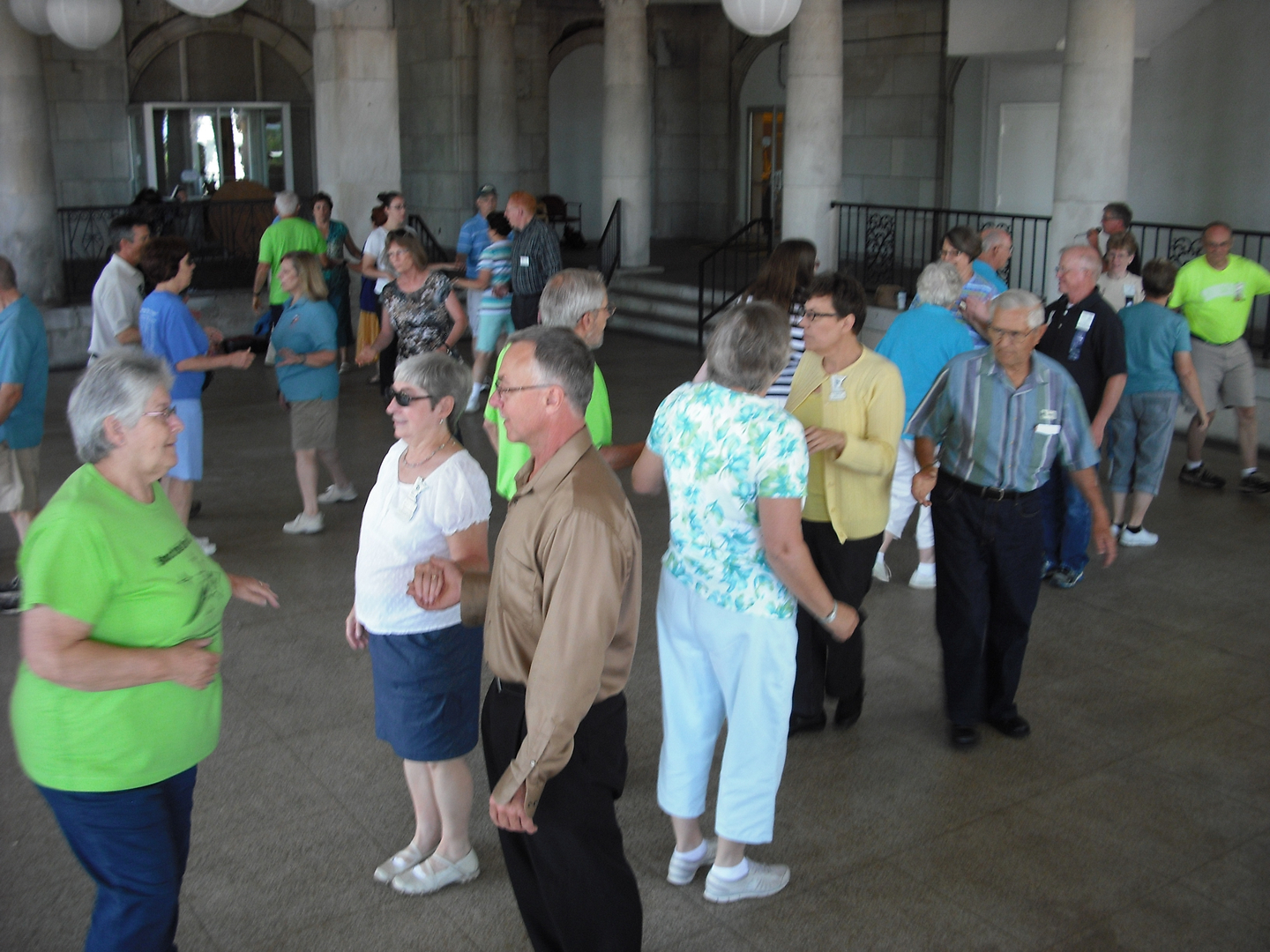 June 21, 2015 – Before departing the hotel in Mundelein, the tour members danced for the hotel staff in the lobby. Tour arrived in St Joseph, Michigan, where Village Squares reserved the Whitcomb Veranda for a short dance and lunch courtesy of the Square and Round Dance Association of Southwest Michigan. The tour then traveled to Millers Merry Manor in New Carlisle, Indiana, where Elisa and Frank Berger had arranged for a short dance/demo. After departing New Carlisle the tour traveled to Norwalk, Ohio, for dinner and a mob dance in the restaurant. The tour spent the night in Erie, Pennsylvania.