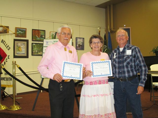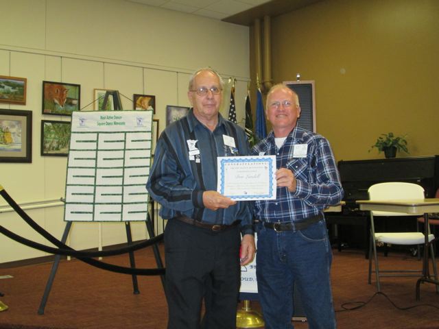 July 19, 2015 – SDM Summer Celebration, Dance, Annual Meeting, Awards, and Potluck, St Cloud Whitney Center, Callers Tom Allen, Monte Gunzler, Andy Flint, Tom Jacobs and Dick Rueter, Cuers Sarah Klaphake, Jane Simpson and Ken LaBau. Ninety-one dancers were in attendance and everyone had something extra to celebrate with the news that SDM and all of its affiliates are tax-exempt 501(c)(3) nonprofits. Don Hanson, Bob Meyer, Mary Kay Amberg, Deb Hollimon and LeRoy Elfmann were elected as Board of Director members. Awards were presented for “Live Lively,” “Traveler” and “Most-Active Dancer. Don Lundell, a member of Afternoon Squares and County Line Squares, received the first “Most-Active Dancer” traveling banner award for attending 113 dance events from February to June 2015.