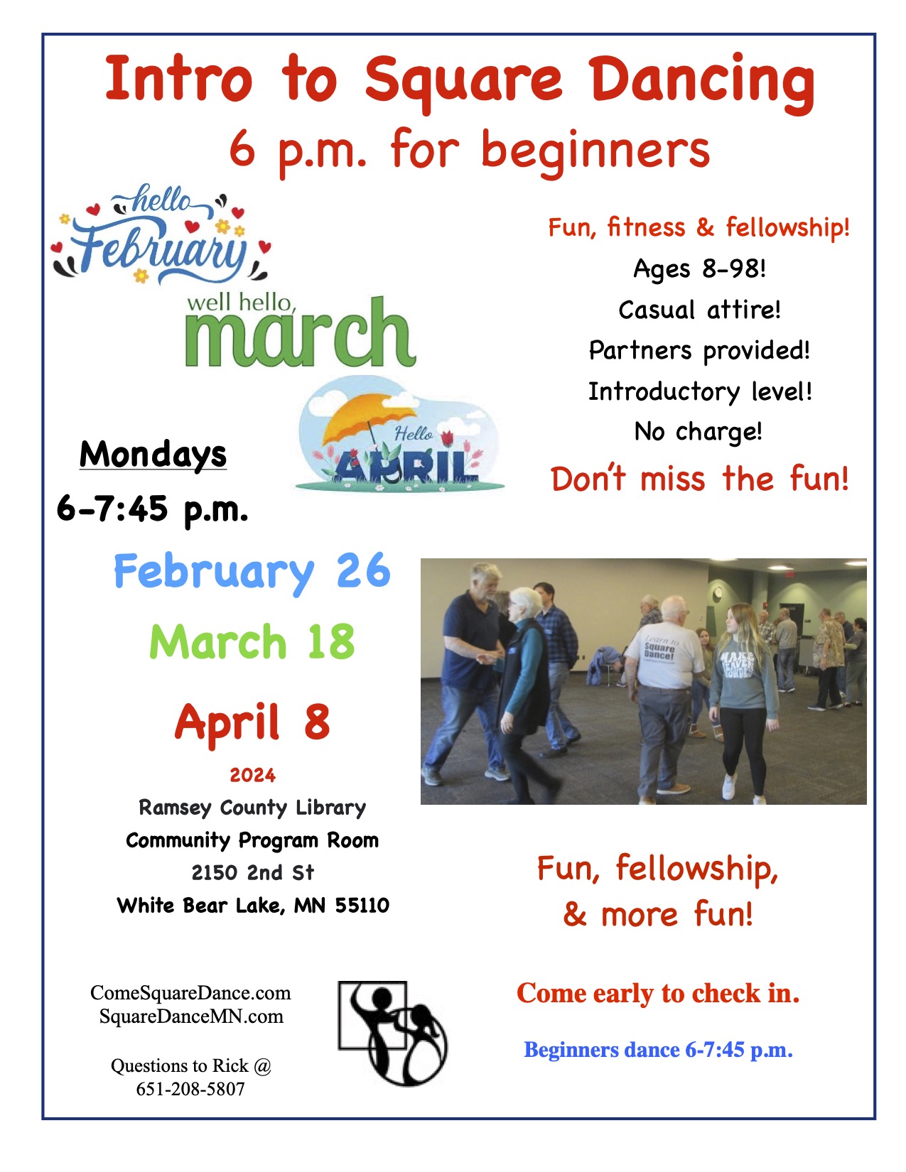 Intro to Square Dancing (“Beginner Square Dancing” 6:00-7:45 pm). Ar-Dale Dancers Flier