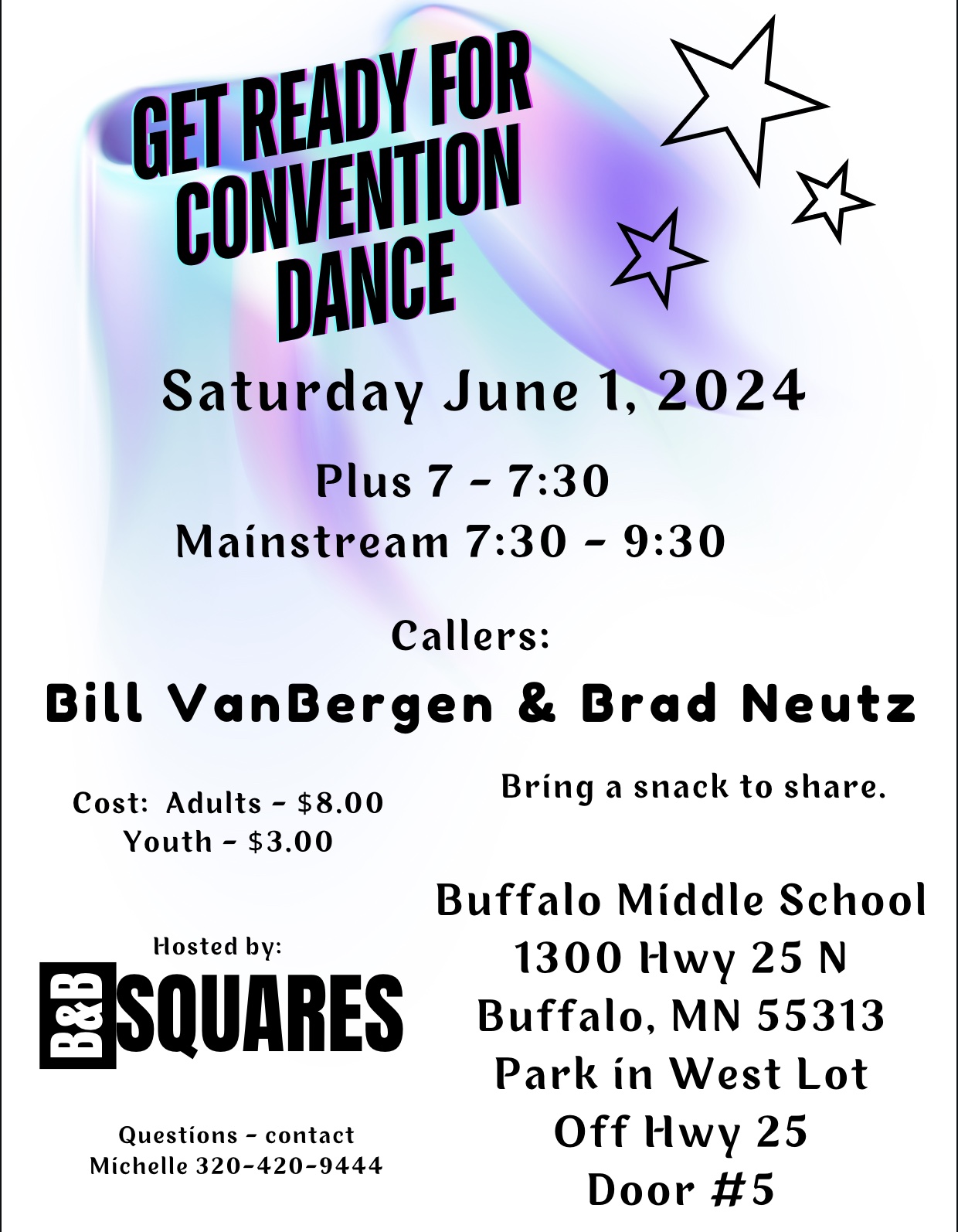 “Get Ready for Convention” Square Dance (Callers Bill VanBergen and Brad Neutz – “Plus” 7:00-7:30 pm; “Mainstream” 7:30-9:30 pm; Cuer Doug Brodeen – “Rounds” between tips). Please bring a snack to share. B&B Squares invites you to come make history with us by dancing at our very first dance as a club! B&B Squares Flyer